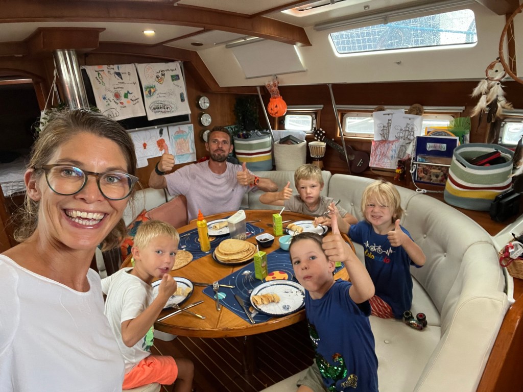 Wat onszelf betreft is het leven aan boord op zijn minst intensief te noemen. We zijn juf/meester, elektricien, loodgieter, klusjesman, schipper, navigator, kok, hulp huishouding en meer tegelijkertijd. En dan nog gewoon papa en mama. Niets is ‘even’ en alles wat we doen vergt voorbereiding: van tochtplanning tot proviandering. Maar door iedere middag even een momentje rust te pakken, vinden we daarin een balans. Als ik dan toch iets moet noemen wat tegenvalt dan is het de hitte: de temperatuur zakt niet onder de 30 graden met uitschieters tot 37 graden aan boord. Daar heb ik fysiek wel last van. Zal de leeftijd zijn 😆.