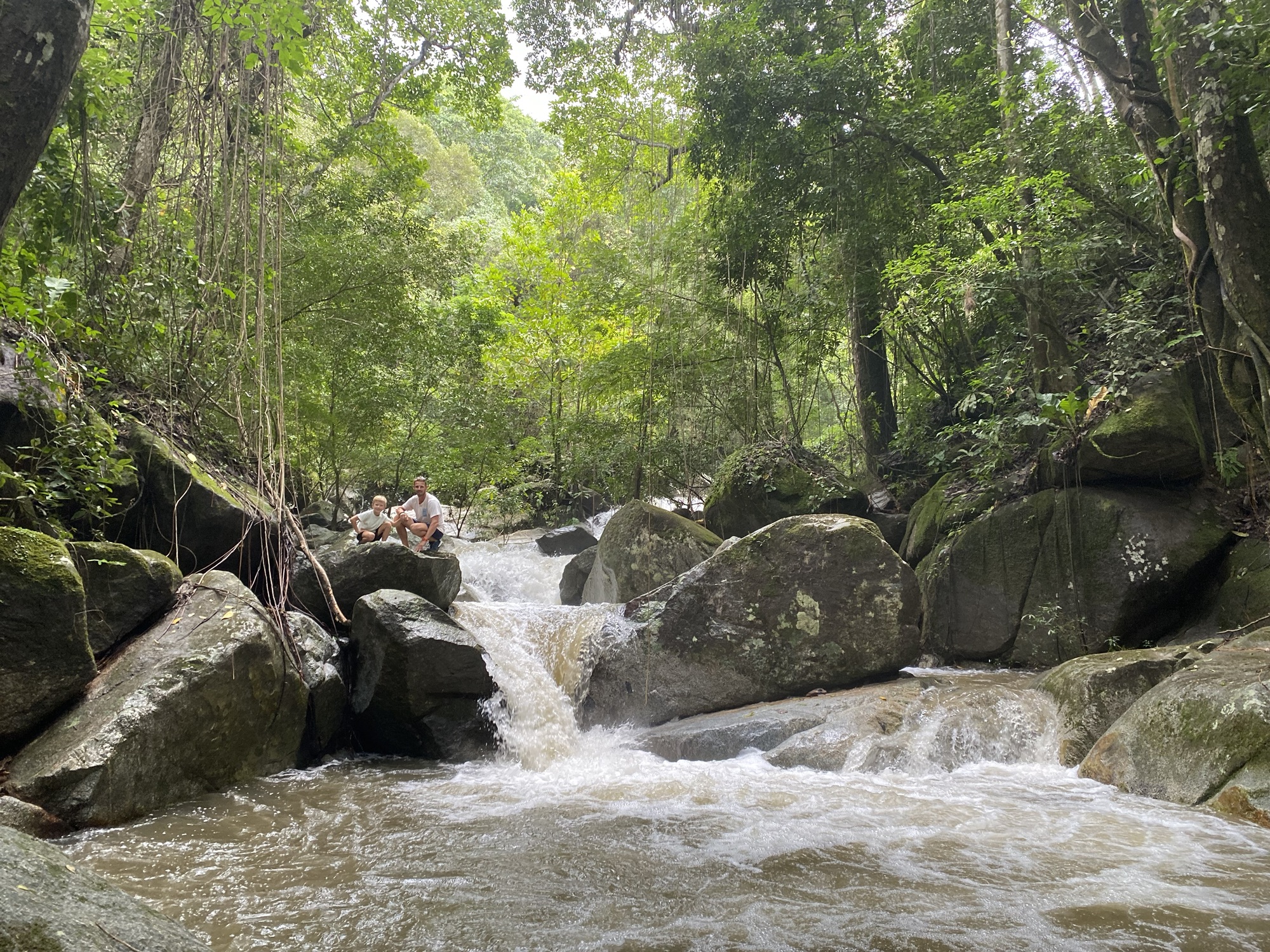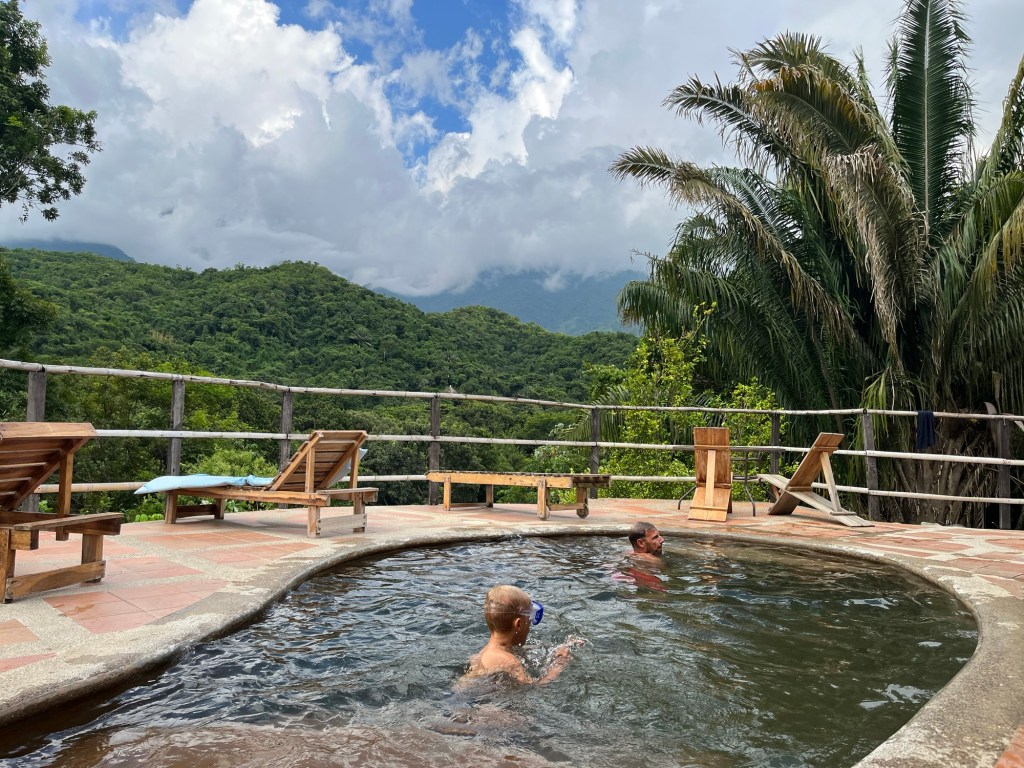 We begonnen met het natuurlijke zwembad ‘beneden’, wat achteraf het koelste bleek. Daarna namen we de tientallen treden langs de bergwand naar boven voor het tweede zwembad met weids uitzicht. De wolken zwelden zoals meestal in de middag aan en de eerste dikke druppen vielen uit de lucht. Snel verplaatsten we ons naar zwembad nummer drie dat tot onze verrassing een warm bad was. De bui was inmiddels losgebarsten en de dikke koude druppen verkoelden ons gezicht terwijl ons lichaam verwarmd werd door het bad. Het leek wel een spa 😇.