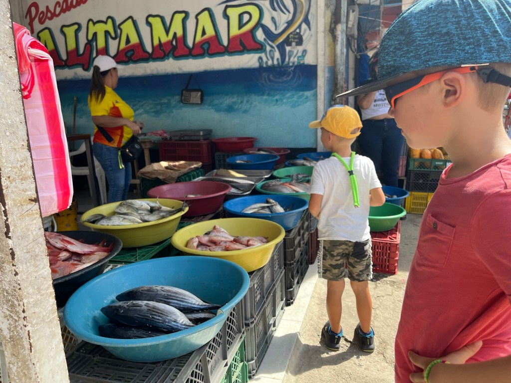 Het zweet druipt inmiddels van me af. Ik kruip over de vloer van de boot om in alle hoeken en gaten onder de vloerplanken proviand te stoppen. In San Blas hebben we de komende anderhalve maand geen toegang tot een supermarkt. Er vaart wel een groenteboot door het gebied dat honderden bewoonde en onbewoonde eilanden telt. Maar die boot moet je natuurlijk net weten te treffen. We nemen dus het zekere voor het onzekere en bezochten gisteren de lokale markt van Santa Marta voor verswaren. We skipten school van de jongens en gingen in plaats daarvan dus ‘op excursie’. Bent en Bruis keken hun ogen uit! Hompen vlees hingen aan grote haken in de kramen van de hoge met golfplaten bedekte hal: een bil van een varken, een ribbenkast, hele kippen. “Bah, het stinkt hier mama”, riepen de jongens in koor. Even verderop lag vers gevangen vis in alle kleuren en maten. De vrouw achter de kraam wuifde met een stokje met aan het uiteinde een klosje de vliegen weg.