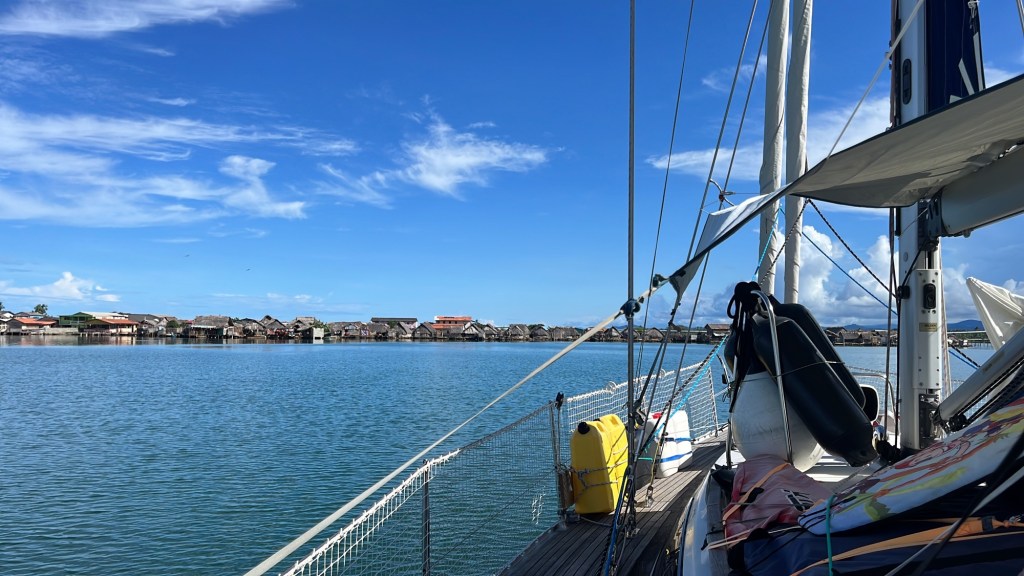 Het lijntje van de dinghy wordt direct aangenomen door een Guna die de boot vastmaakt. “Is dat een drol?”, roept Bruis vol afschuw. Een perfect gevormde drol drijft langs de dinghy; naast de kade zijn twee toilethutten. Nog voordat we allemaal op de kade staan, is er iemand opgetrommeld die wat Engels spreekt. Hij biedt aan ons een tour van het eiland te geven en daar gaan we graag op in. Het blijft een wondere wereld. Zo ver we kunnen kijken zien we rieten hutten met elkaar verbonden door stoffige steegjes. Er zijn geen straten en er is geen gemotoriseerd verkeer; er is zelfs geen fiets of step te bekennen. Ook is er nagenoeg geen groen op het eiland. We geven onze ogen de kost. Was ligt te drogen op de rieten daken of schuttingen, waarachter het leven van de Guna’s zich afspeelt. Nieuwsgierig steekt een Guna- vrouw haar hoofd boven de schutting uit. Kinderen lopen achter ons aan als we een weg door het dorp banen. We zien volwassen vrouwen in traditionele kleding met daarop geborduurde mola’s. Ze dragen kleurrijke sieraden van de enkel tot de knie en pols tot elleboog. Aan de andere kant zien we jongeren in spijkerbroeken of korte broekjes met een naveltruitje. Luide muziek schalt uit een draagbare muziekbox als we een groepje jongens passeren. Één van hen heeft een mobieltje vast. En zo doet ook hier de moderne wereld langzaam haar intrede. Toch voelen we ons indringers in deze kleine en traditionele leefgemeenschap. Enerzijds omdat onze leefwijze zo ver afstaat van die van hen, maar ook heel letterlijk, omdat we hoog boven de Guna’s uittorenen en onze lompe lijven misplaatst voelen in de smalle steegjes tussen de huizen.
