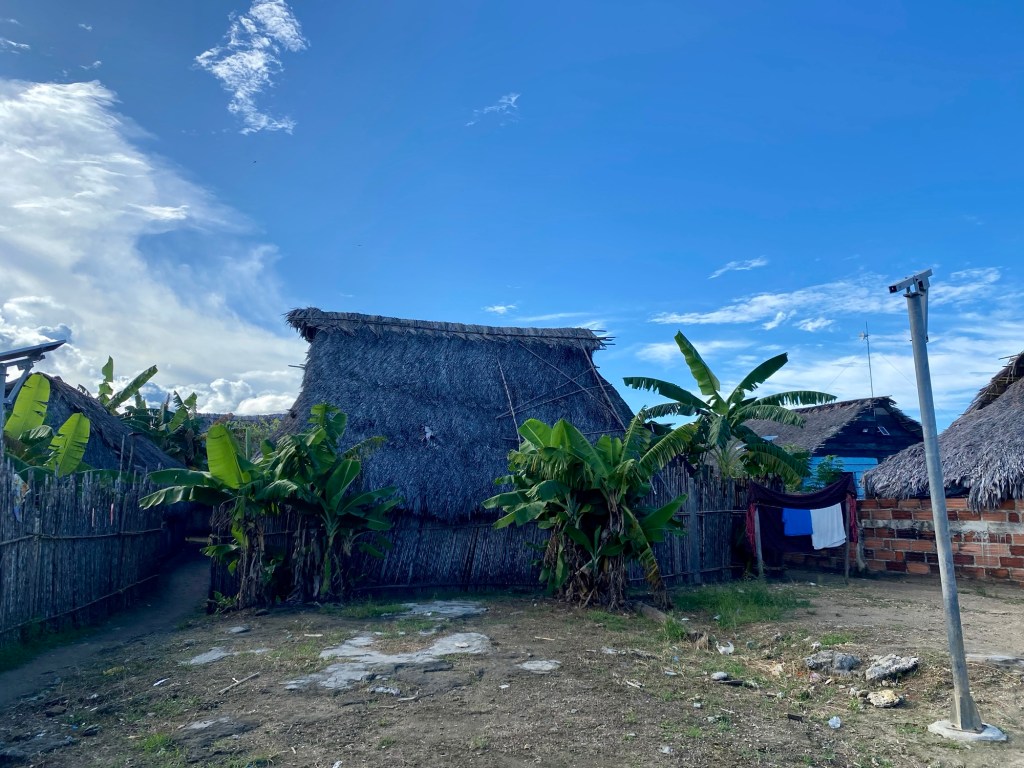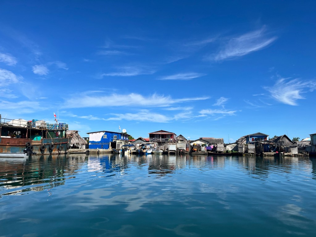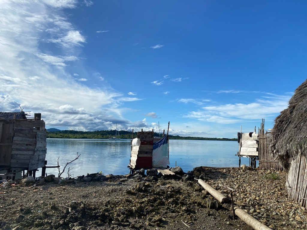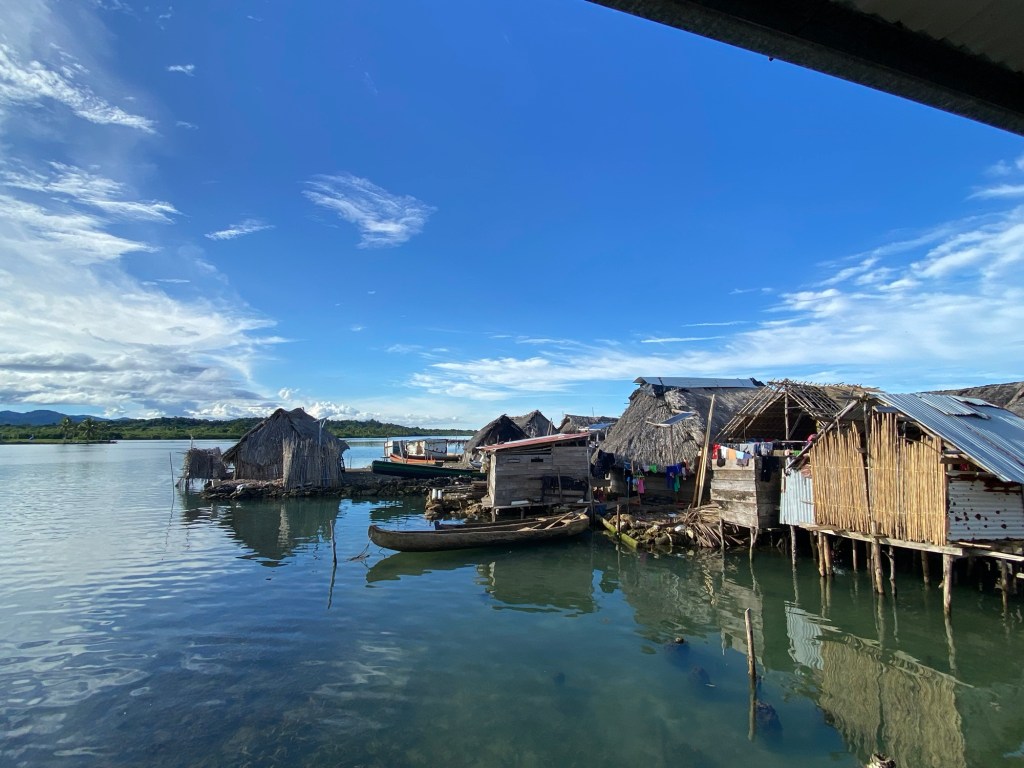 De gebeurtenissen lijken alweer een hele tijd geleden want iedere dag hier is een dag vol nieuwe indrukken. Ik kijk uit over Mulatupu, het eerste Guna-dorp dat we bezoeken. Het hele eiland past in één blikveld. Een loopbrug verbindt het dorp met het vasteland waar een ziekenhuis in aanbouw is en tevens de schoolgebouwen staan. Het dorp bestaat uit hutten van natuurlijke materialen en een enkel gebouw van steen die allen dicht tegen mekaar zijn gebouwd tot aan de waterkant. Met opgestapeld koraalsteen wordt gepoogd het eiland tegen het wassende water te beschermen. Een onbegonnen zaak… Ín het water staan kleine hutten van een meter bij een meter met het land verbonden door middel van een loopplank. Daarin zijn toiletten gevestigd zodat de poep en pies direct de zee in plonst.