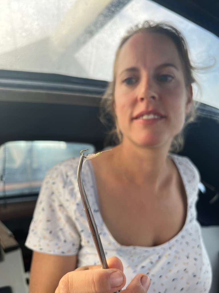 Connie kwam direct aangesjeesd in de dinghy. Bruis jammerde erg van de pijn, maar was dankzij een filmpje weer een beetje gekalmeerd. De haak heeft een weerhaakje dus eruit trekken zou pijnlijk worden. Maar het haakje doorduwen tot hij er aan de andere kant weer uit zou komen, leek ons net zo traumatisch. Eerst verdoven dan maar? Verdovingsmiddelen heb ik aan boord en tijdens een cursus EHBO voor zeezeilers hebben we geoefend met injecteren. Maar om het daadwerkelijk toe te passen, en nog wel op je eigen kind, is een ander verhaal. Gelukkig was Connie de ‘arts’ daar. “Shit, waar ligt die EHBO-kist met spuiten en injectienaalden”, vloekte ik. Ik had geen idee waar ik die opgeborgen had. Leermoment!