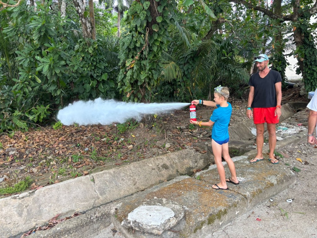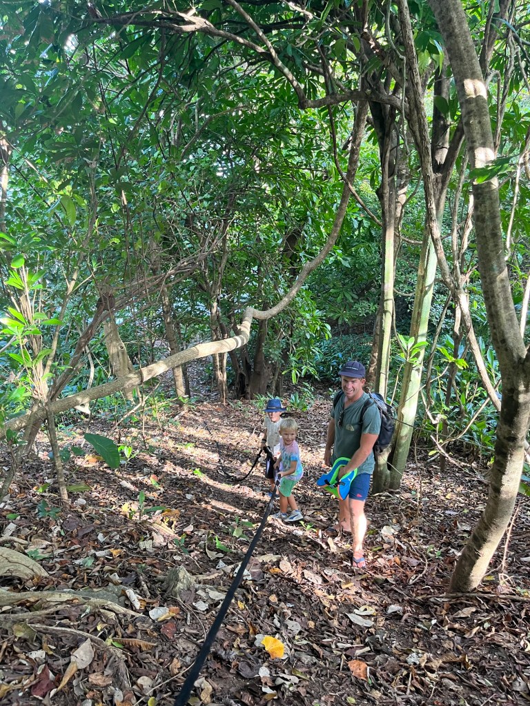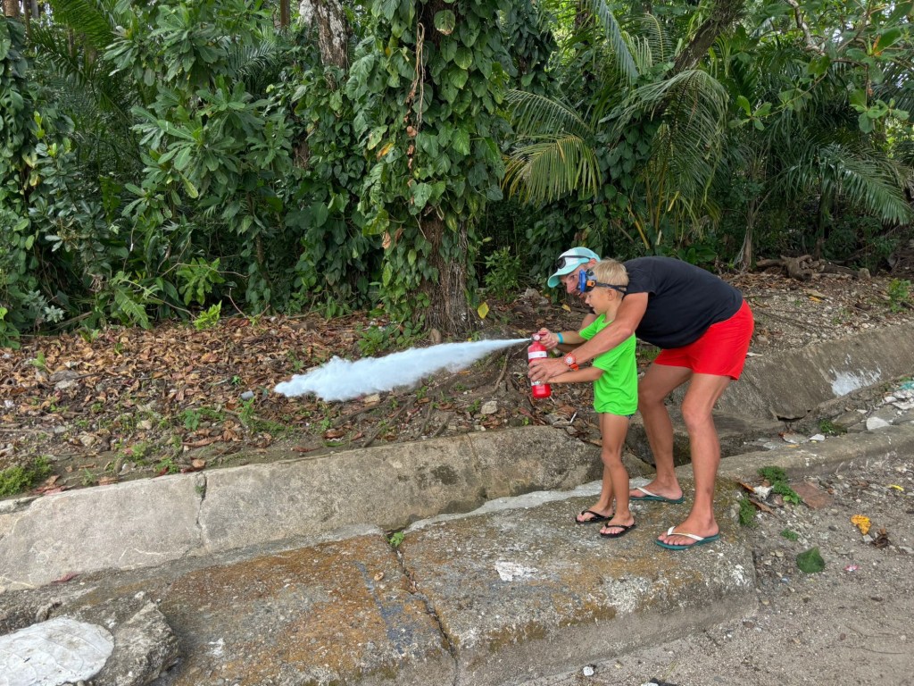 Ik neem een slok koffie uit de thermosmok in mijn hand en denk na over het antwoord. Het gebrul van apen in het woud om me heen leidt me een moment af. Vanuit de haven loop je zo de jungle in en deze ochtend maak ik een wandeling met Jess. Ze is mama van twee jonge kids (bijna 2 en 3) en is met haar man anderhalf jaar op pad. “Ja, het is eigenlijk precies zoals ik verwacht had”, antwoord ik haar. Ik wist door onze eerdere reis met Puff wat het cruisen inhoudt: de hoogtepunten én de uitdagingen. Je hoeft mensen het gelukzalige gevoel niet te uit te leggen van het ankeren voor een onbewoond eiland met een parelwit strand en wuivende palmbomen. Toch? Maar van hoe het dagelijkse leven aan boord eruit ziet, hebben weinig mensen een goed beeld. Zoals de bijna onvermijdelijke verdeling in pink & blue jobs, het intensief samenleven in een kleine ruimte, de tijd en energie die het kost om simpele dingen voor elkaar te krijgen zoals de was doen of de zoektocht naar waren in steeds weer nieuwe, vreemde plekken. En dan hebben de zeilende gezinnen daar nog de taak van het onderwijs bij. Tegelijkertijd is er niemand om op terug te vallen, geen opa’s of oma’s, geen opvang of oppas. Je vervult al die rollen zelf. Al dat had ik helder voor ogen voor we deze reis aanvingen. Bewust hebben we ook gekozen om deze reis te maken in deze leeftijdsfase van de jongens waarin ze relatief zelfstandig zijn en bovendien kunnen zwemmen.