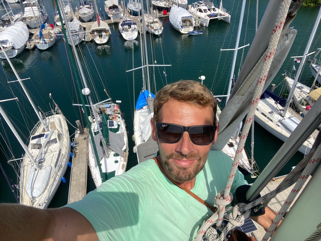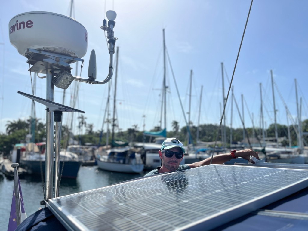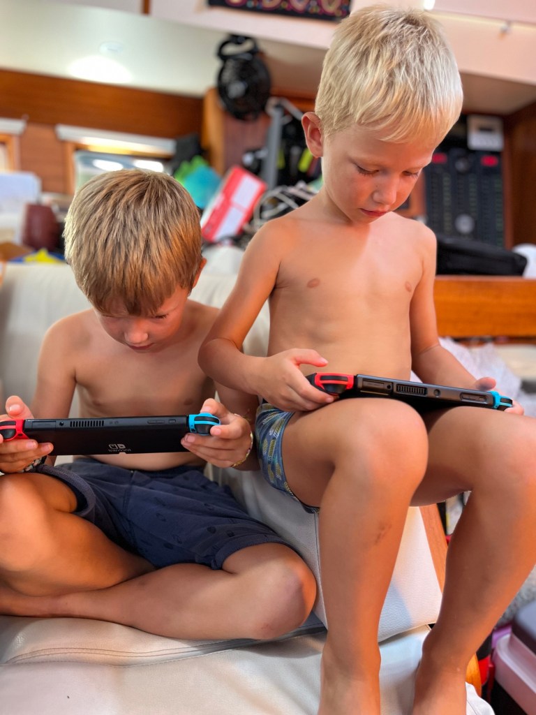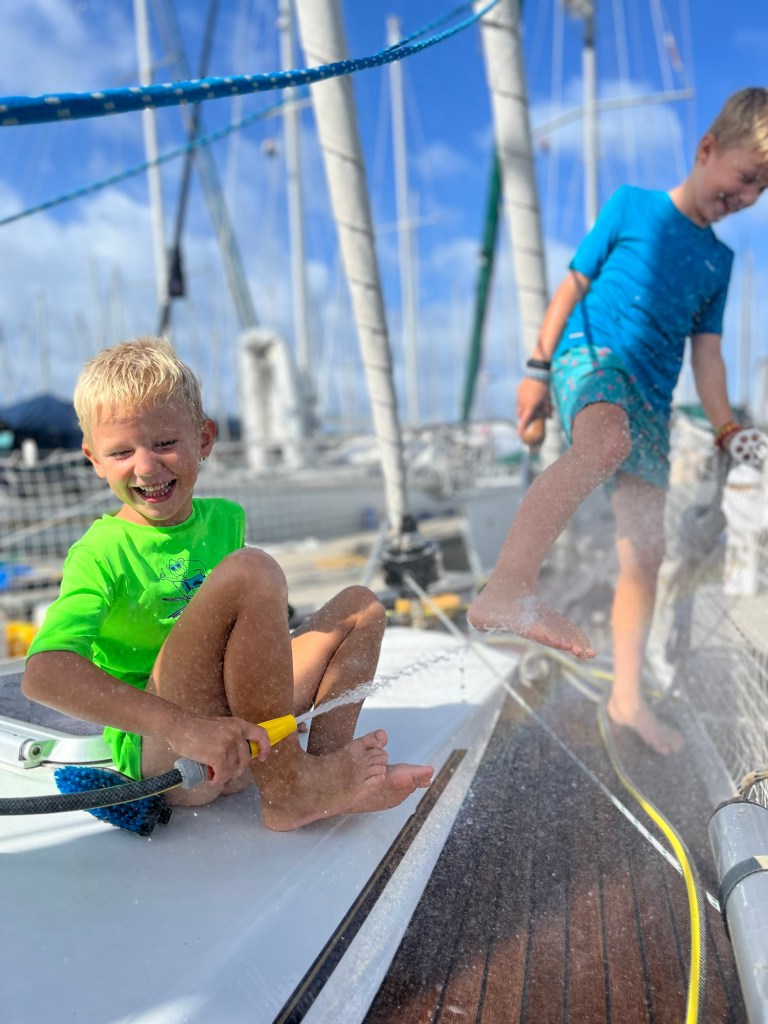De jongens zelf zijn inmiddels al volledig aan deze leefstijl gewend. De afgelopen weken in de haven stonden in teken van inkopen en bootklussen. Terwijl de jongens onder mijn begeleiding met de neus in de schoolboeken zaten, lag Leon in de bakskist om de stuurinrichting onder handen te nemen en de loospijpen te checken, zat hij op de SUP om de romp in de was te zetten of hing hij over de motor en in de mast. Geen plekje bleef ongezien. Daarnaast verving Leon twee zonnepanelen en installeerde hij Starlink internet. En dat allemaal met een herstellende schouder 💪.