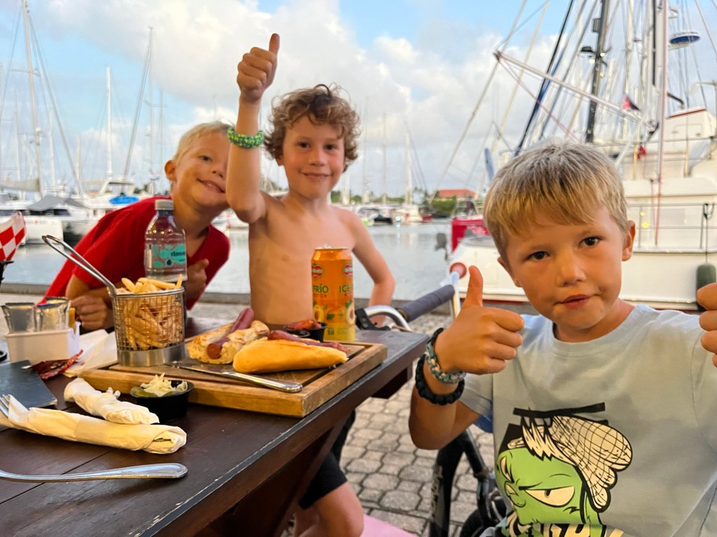 Wat een geluk was het ook dat vorige week de Chill a Lot kwam binnenvaren. Ook een Nederlandse boot met een familie met twee jongens. Het was meteen AAN tussen hun Joep en onze boys. Vier dagen non stop vol d’r op!! Het was als ouder een genot om te zien hoe de jongens hun plan trokken. Zelf erop uit in de haven. We zijn het niet gewend dat we niet weten waar de jongens uithangen. In Harderwijk woonden we op een woonpark, veilig en beschermd achter een slagboom. In de zes maanden op de boot konden de jongens ook niet zelf op pad. We zijn altijd bij ze. En zij bij ons. Maar de jongens worden groter en we kunnen ze steeds iets meer loslaten. Dus zaten we deze week voor het eerst samen te dineren aan de haven terwijl de jongens ‘ergens uithingen’. Even een uurtje quality time. Dat zijn de momenten om te plukken. Om half 10 konden de jongens niet meer op hun benen staan en kwamen ze aankakken. In het vaak zo bedenkelijke gezicht van Bent las ik een combinatie van moeheid, opwinding en gelukzaligheid. Zijn zelfvertrouwen groeit elke dag en ik zie hem openbloeien.