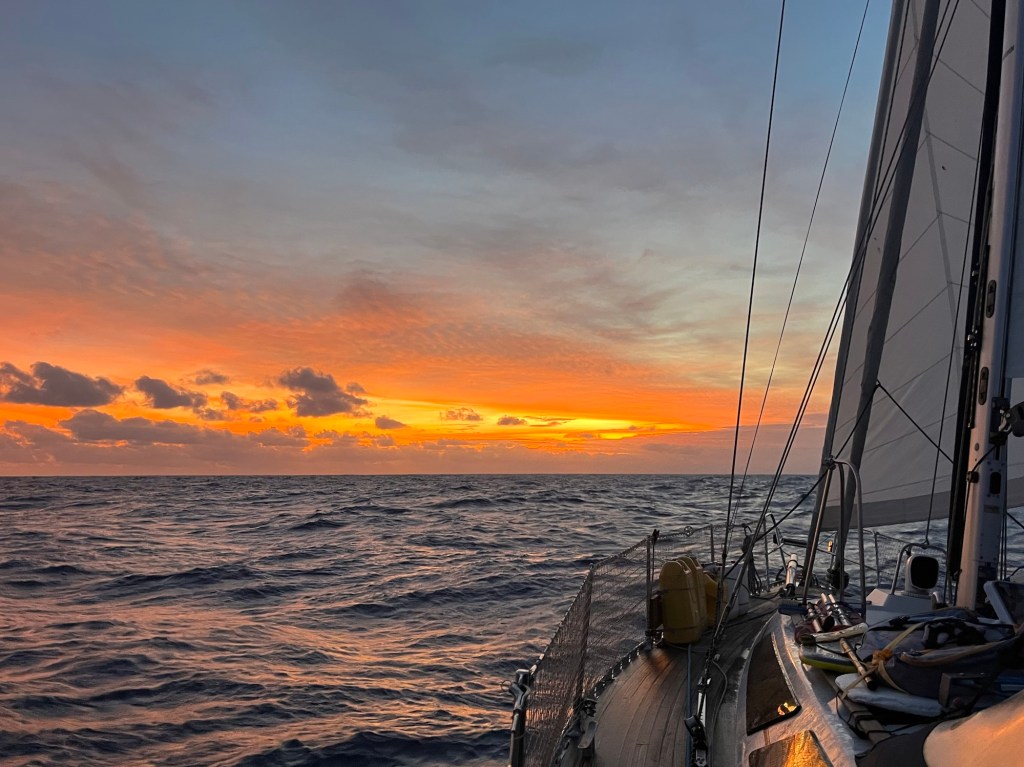 De wind waait de hele dag al tussen de 18 en 22 knopen en we speren door het water. We hebben de ‘red dot’, zoals we het gebied met onweer gedoopt hebben, noord van ons gelaten. De zon deed haar best de wolken te verdrijven en zette zojuist tijdens haar ondergang de hemel in lichterlaaie.