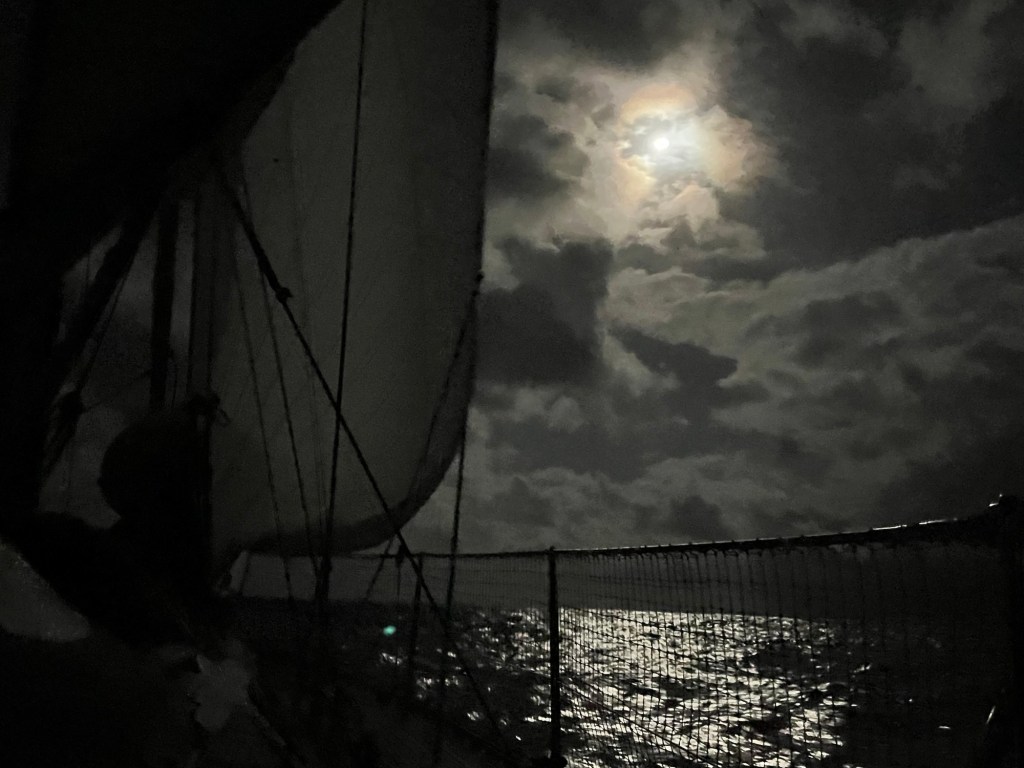 De nacht werd verlicht door een aanzwellende maan. Zou hij morgen over overmorgen vol zijn? Ik staarde in het niets met muziek in mijn oren. Drie uur lang keek ik dom voor me uit. Zonder gedachten, mijn zintuigen alleen afgestemd op de bewegingen en geluiden van de boot. “Lekker wachten”, zoals Bent zou zeggen. Mijn uren, die ik met niemand hoefde te delen. Alleen met mezelf.