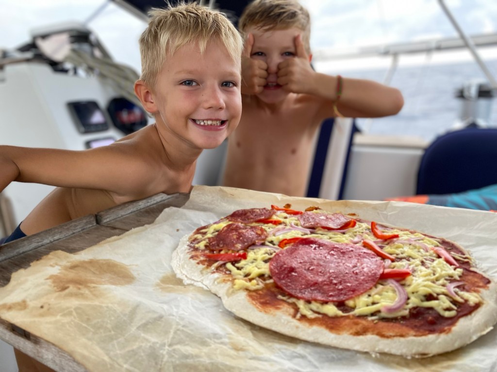 Gisteren was een fantástische dag. De wind was een paar knopen minder hard en de zee kalm. Omdat de wind steeds oostelijker inkwam, pasten we de zeilvoering aan naar een voordewindse setup: genua uitgeboomd over bakboord en grootzeil over stuurboord. Ook wel vlinderen of melkmeisje genoemd. De boot was perfect in balans en de snelheid bleef rond de 6 knopen. Zo zeilden we de dag uit. Door de mindere zeegang lag de boot vrij stabiel in het water. Dat maakte dat de jongens voluit konden spelen en hutten bouwen zonder zich steeds vast te hoeven grijpen om staande te blijven. Ikzelf poetste de kajuit en Leon schrobde de boobieshit van het voordek. Aan het einde van de dag had ik zelfs nog energie om met Bent pizza’s te maken. Smullen!