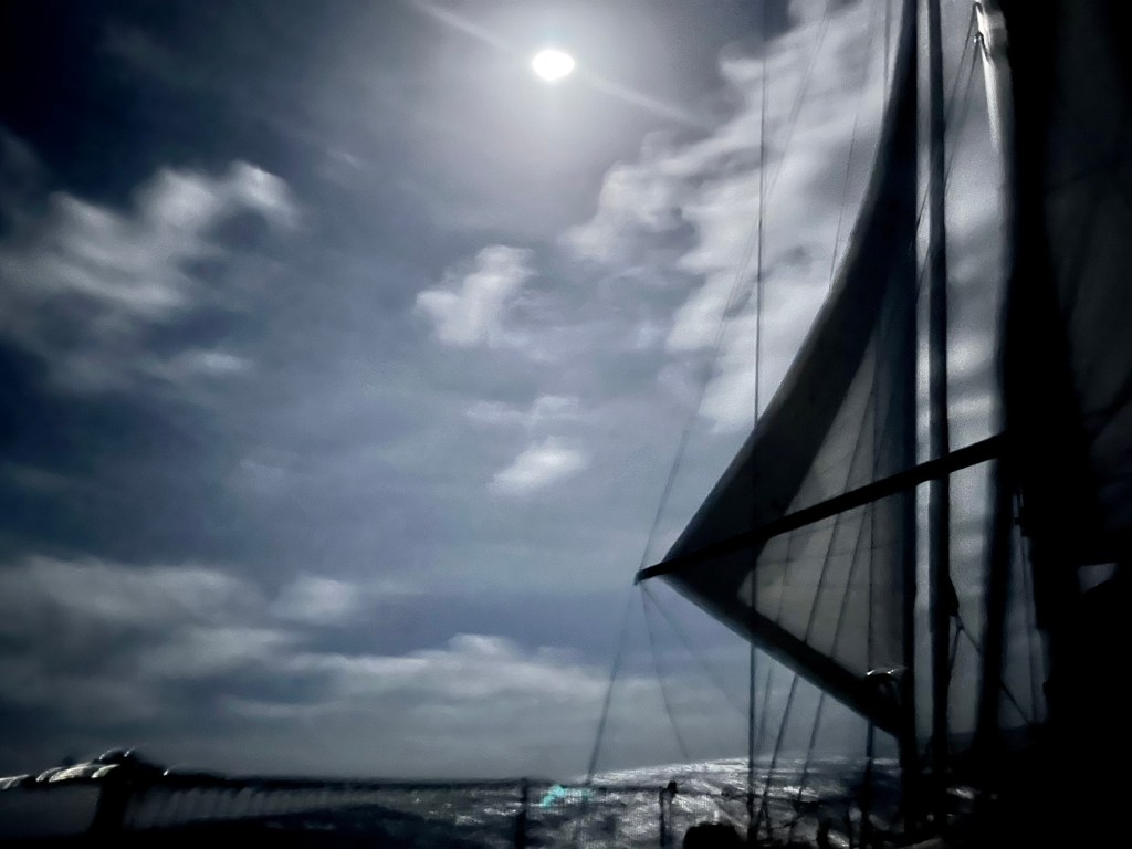 Vannacht sliepen we als ossen. Ik dook op tijd het bed in en gunde Leon een extra uurtje slaap tijdens de nacht. Na dagen van hoge bewolking waar de zon alleen met veel moeite doorheen wist te komen, deinden we nu onder een heldere hemel voort, bijgelicht door de volle maan. Het leek wel of er een schijnwerper op ons gericht was, zo fel.