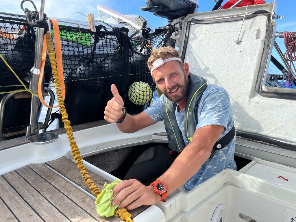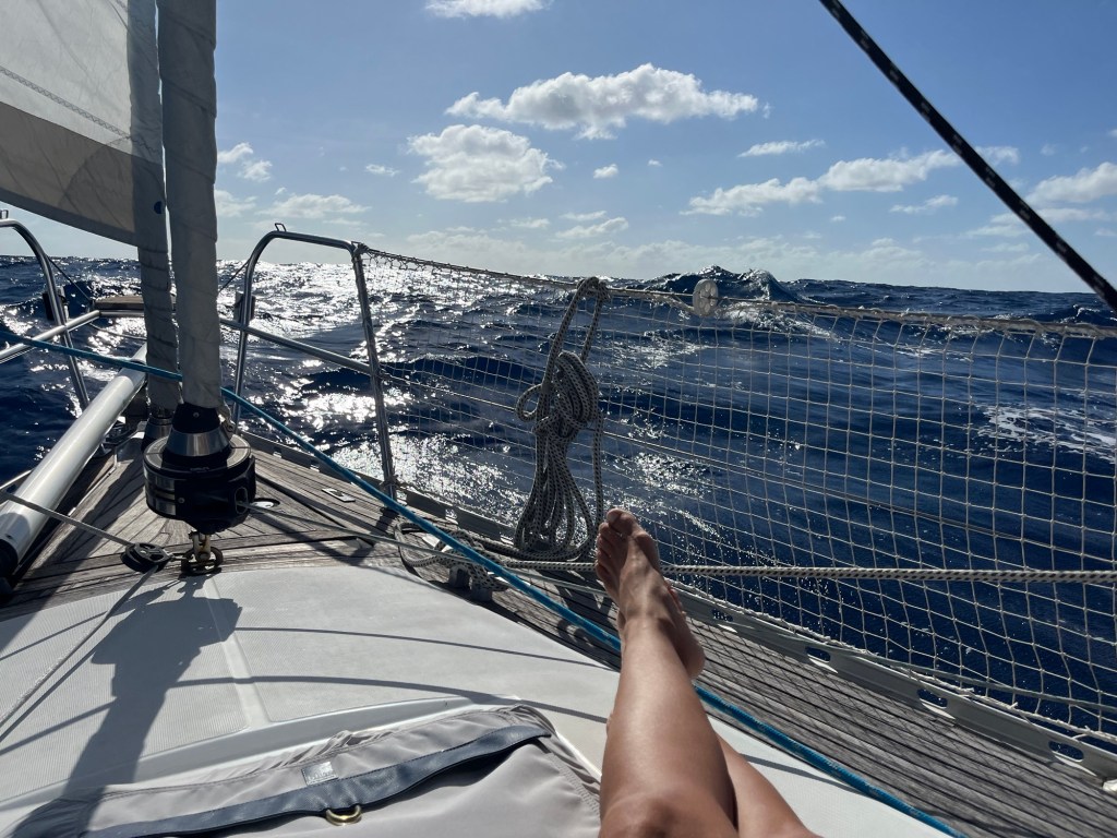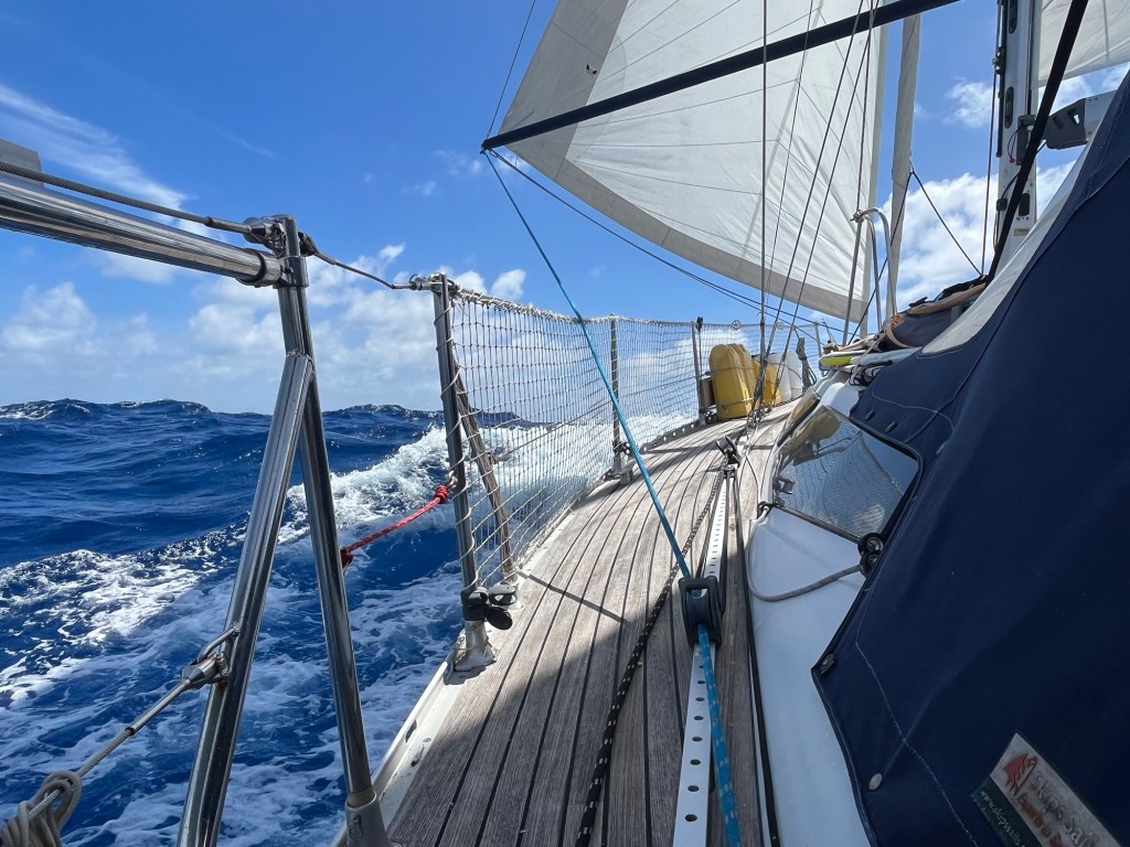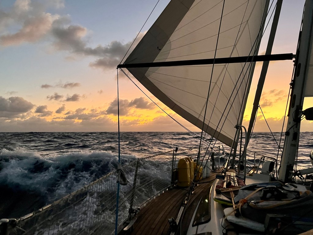 De nieuwe dag bracht een nieuwe belofte. Maar eerst een roercheck. Leon huiverde bij het openmaken van de bakskist, toch bang iets aan te treffen wat we niet wilden. Maar nog geen minuut later kreeg ik een duimpje omhoog. Situatie stabiel! De passaatwind trok aan naar 20 knopen, de zeilen bolden ijverig en de zon brak eindelijk het wolkendek. De golven bouwden zich al gauw op naar een kleine drie meter en Le Tournesol surfde er met plezier vanaf.