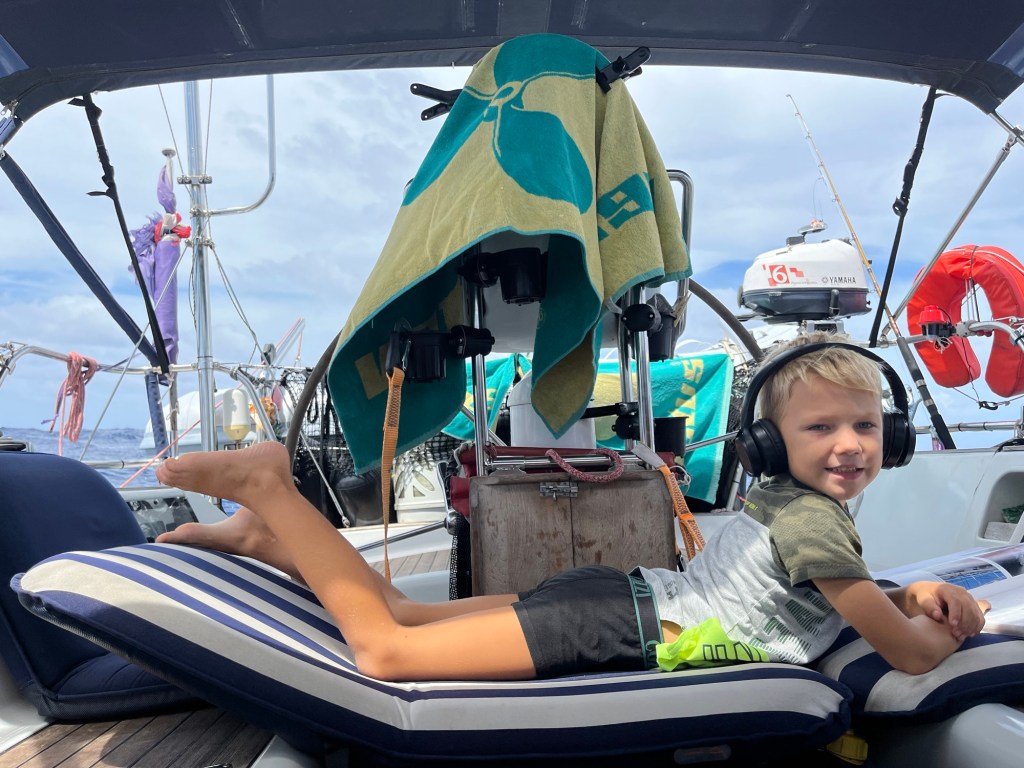 Vanuit de kuip keek ik uit over het diepblauwe zilt om me heen. De verblindende kleur komt pas echt tot uiting op zonnige dagen als deze. Op de kuipvloer staan de jerrycans die normaal gesproken in de bakskist staan. Om het roer te monitoren, willen we deze kist vrijhouden. De jongens maakten van de nieuwe situatie gebruik en bouwden de kuip om tot één groot bed. Samen met Leon bekeken ze de foto’s in de vaargids van Frans-Polynesië. De plaatjes kregen goedkeuring van de jongens.