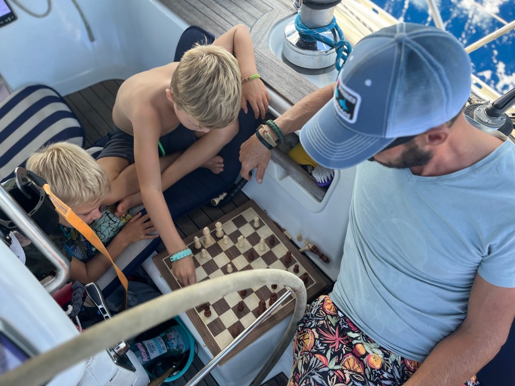 Later speelt Leon nog een potje schaak met de jongens. En ik zie mijn kans schoon om in mijn eentje in stilte op het voordek te gaan zitten. Ik aanschouw hoe de golven de boot dragen. We worden van achter opgetild en laten met een slingerbeweging de golf onder ons door rollen. Dan tilt de golf de boeg op om vervolgens zijn pad te vervolgen en ons over te dragen aan de volgende golf.