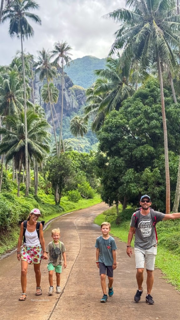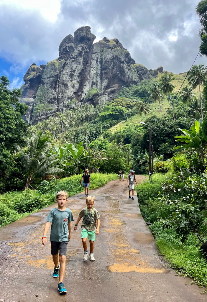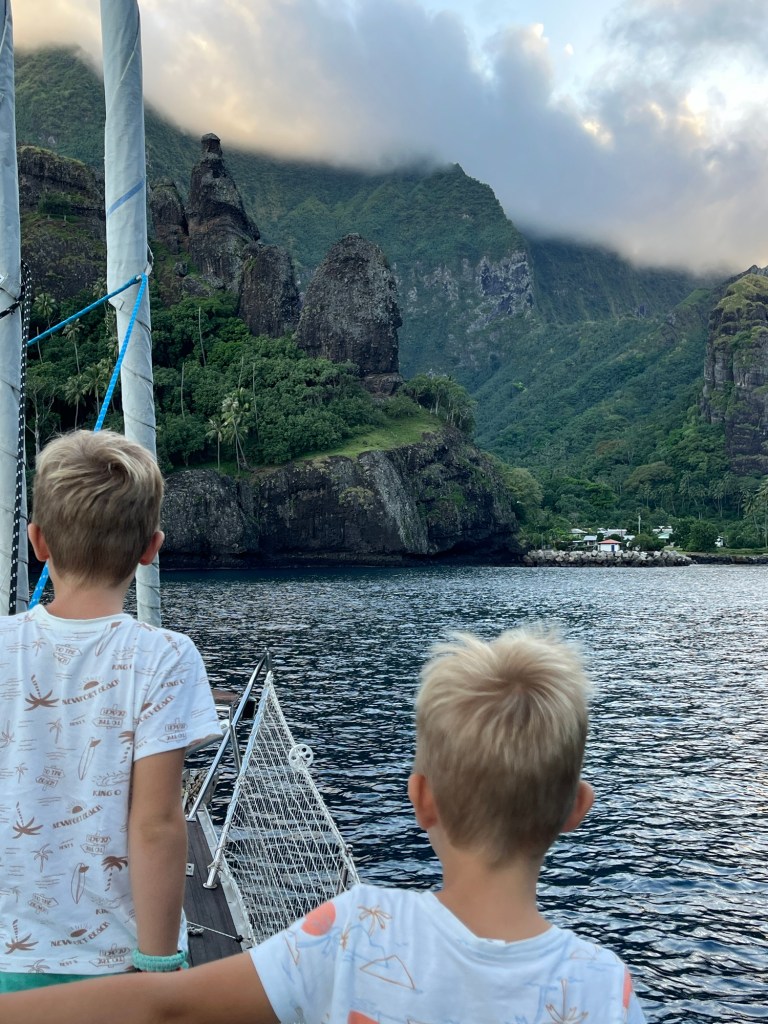 Ik houd mijn blik op het silhouet van het eiland gericht terwijl we met de wind meedraaien om het eiland heen. Eenmaal in de luwte van het eiland dobberen we gedurende de nacht op een afstand van enkele mijlen, wachtend op het eerste licht. Even na vijven komen de jongens aan dek. “Is er land te zien mama?” “Kijk maar eens om de buiskap heen, jongens”, zeg ik. Bruis geeft het eiland in zijn enthousiasme wel twintig luchtkusjes. “Ik kus het eiland mama!”, roept hij uit. Om zes uur wekken we Leon, gaat de motor aan en draaien we de boeg naar de ankerplaats van Hanavavae.