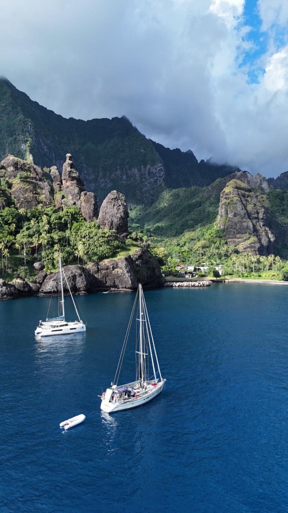 De baai is diep, de ankerbodem niet heel goed en de wind vlaagt over de kammen. Er liggen maar vier boten in de baai wat maakt dat er plek zat is. Tot mijn grote opluchting liggen we bij de eerste poging vast. Ik zak neer in de kuip, een traan rolt over mijn wang. Leon neemt een bak koffie en denkt zijn gedachten op de boeg van Le Tournesol. Er komt een eind aan twintig jaar dromen van ‘landfall’ in het mysterieuze, ruige, bijna mythische Fatu Hiva. Een ongekend gevoel van trots en dankbaarheid maakt zich van me meester.