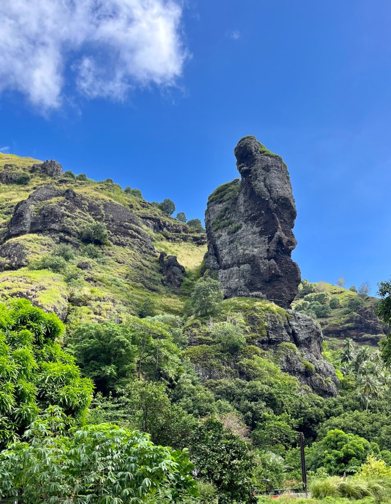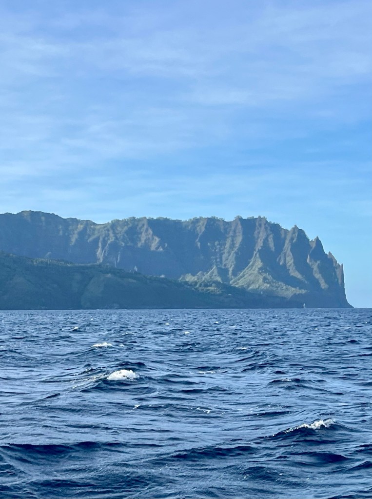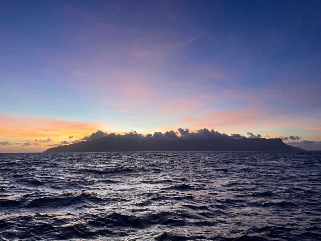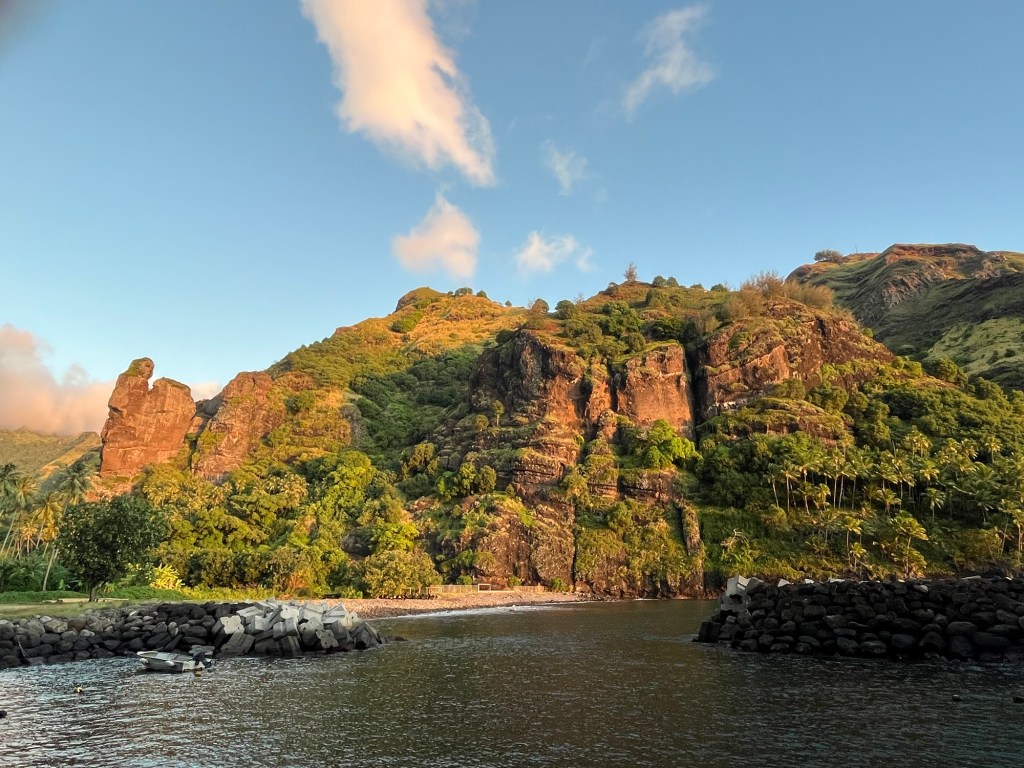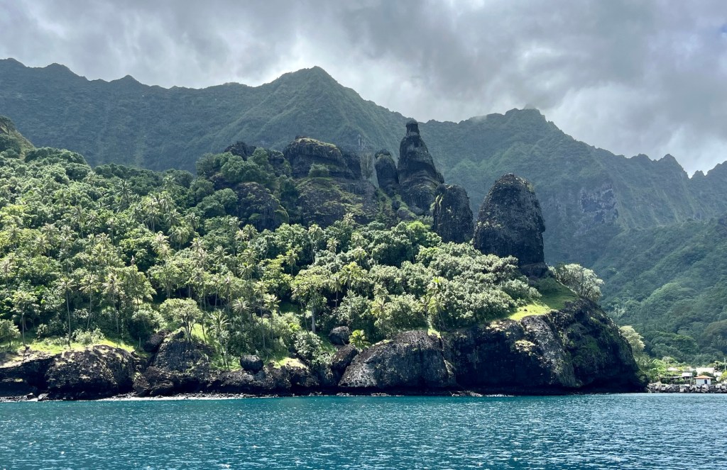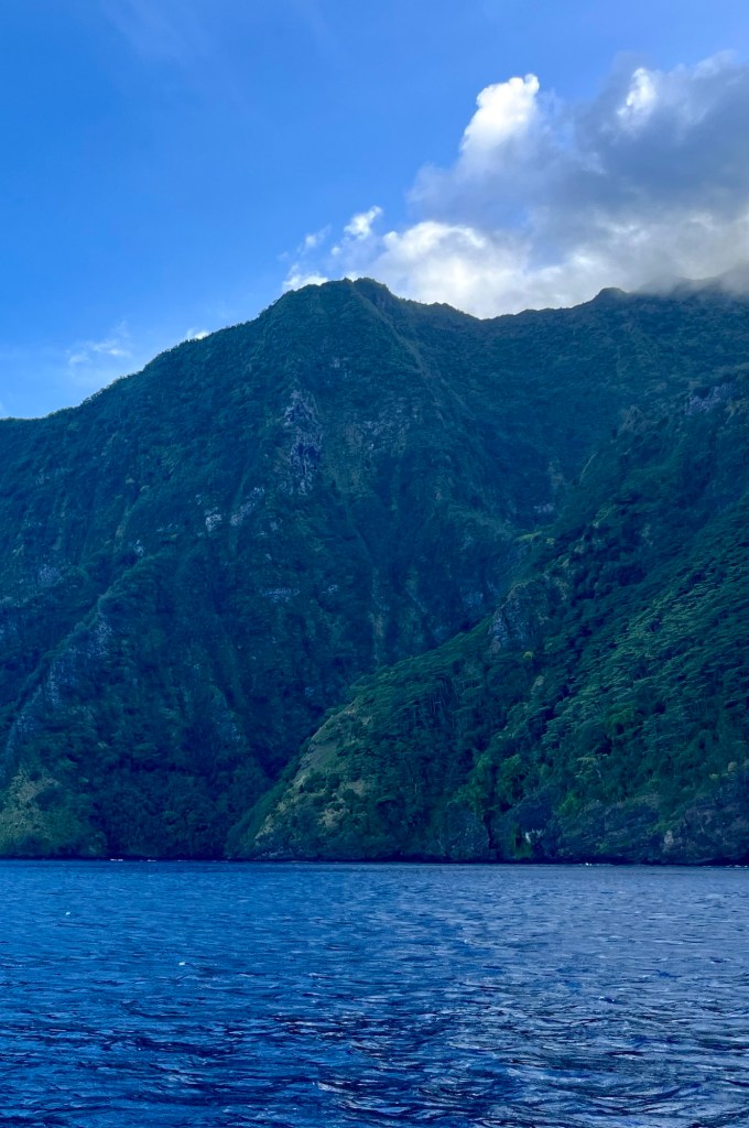 Hoge kliffen met dramatische rotsformaties en grillige pieken doemen op. Eerst heiig, daarna met steeds meer reliëf. Naarmate we dichterbij komen, verandert het donkere silhouet in een explosie van kleur. De kliffen zijn begroeid met mos, afgewisseld met loofbomen en palmbomen. De geur van nat groen en bloemen begint door de zoute lucht heen te dringen. In de diepe baai glinstert het diepblauwe water helder en uitnodigend. Het is weelderig, rauw, majestueus, alsof we een nieuwe wereld binnenvaren. Ontzag, opluchting en verwondering. We zijn er!