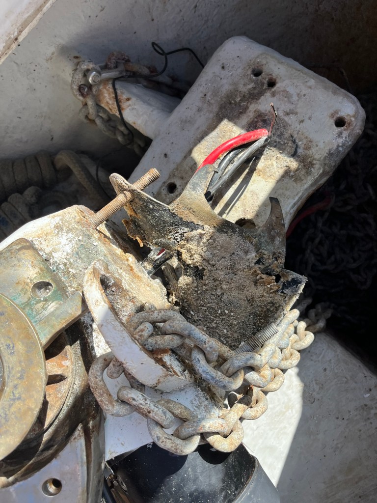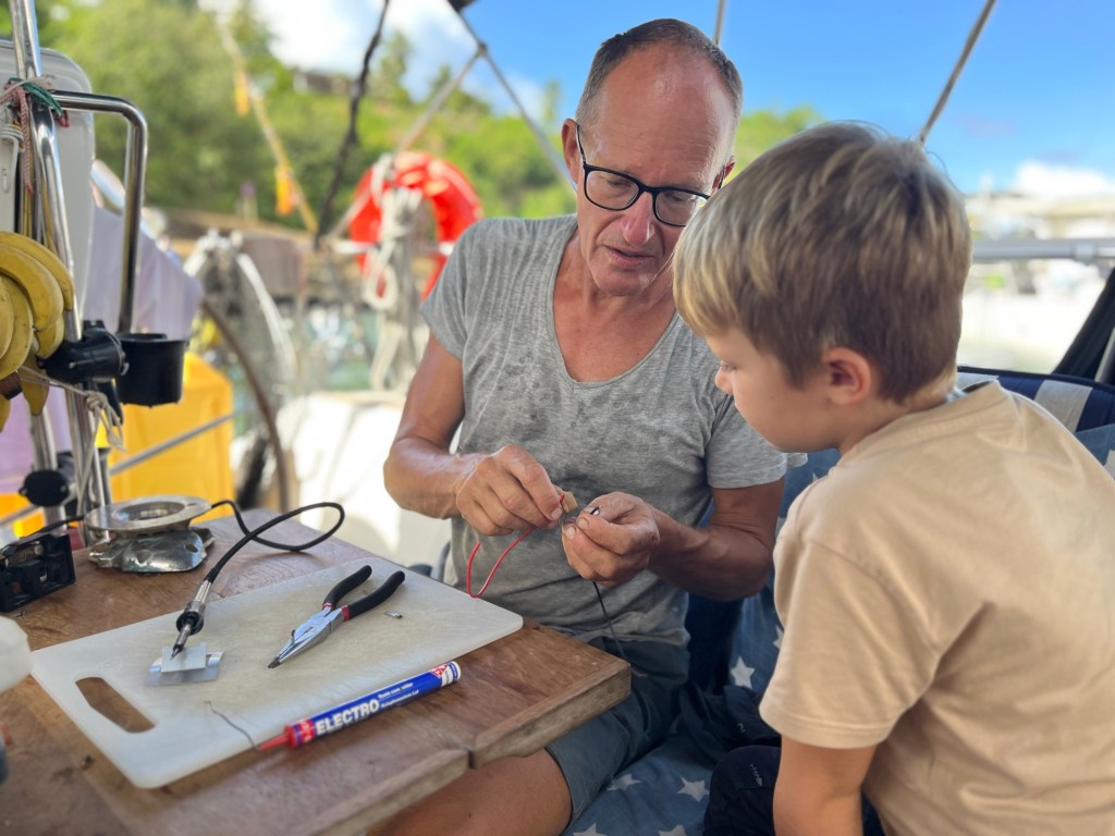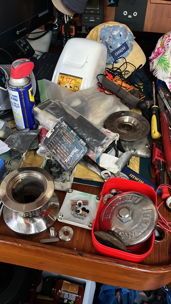 Deze klus was echter een peulenschil als je het vergelijkt met een andere klus die zich aandiende: het reviseren van de ankerlier. Dat is de lier die ons anker met ankerketting uit- en inrolt. Hij ging al een tijdje niet meer zo soepel, maar in Fatu Hiva kregen we de 80 meter ketting die we uitgegooid hadden nauwelijks binnen. Het was tijd om de lier uit elkaar te halen. Gelukkig was daar Richard van Moana Nui die als techneut mee zou kijken. De binnenkant van de lier was flink gecorrodeerd en er stond water in de elektrische verbindingen. Het was een wonder dat het ding überhaupt nog iets deed… Die avond lag de complete lier in onderdelen op de kaartentafel. Er zou de volgende dag flink gesoldeerd, gevet en bekabeld worden in de hoop dat de lier weer een teken van leven zou geven. En dat deed hij natuurlijk, en hoe?! Nog nooit in de tien maanden dat we onderweg zijn, liep de lier zo soepel en snel. In een blink is het anker beneden of boven. Dank voor alle hulp Richard 🙏. Het is waar wat ze zeggen: de wereld omzeilen is eigenlijk gewoon klussen aan je boot op de meest exotische plekken.