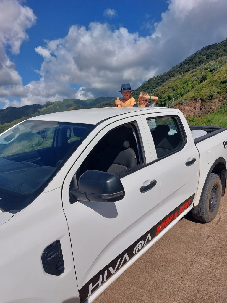 Tijd om te relaxen en het eiland te verkennen. Uiteraard met Niels en Rosan, en Richard en Marianne huurden we twee grote pick-ups en cruisden het eiland rond. De vergezichten waren adembenemend. Zigzaggend langs de rotswanden verscheen om iedere bocht weer een nieuwe kloof met kiezelstranden, palmbomen en zeeën die op de rotsen stuk sloegen.
