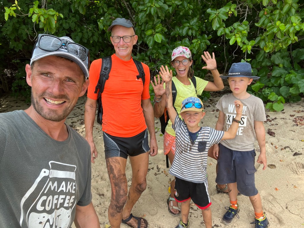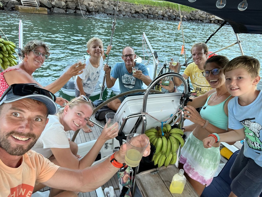 Met de verschillende families besloten we een korte hike te doen. Er was geen pad maar de heuvels rondom de baai leken niet al te hoog en steil dus waagden de crews van Salto, Pinnacle, Curious, Moana Nui en wij het erop. In een treintje liepen we vrijwel recht omhoog, onze weg zoekend tussen struiken en rotsen. De kids liepen voorop en zetten hun beste beentje voor. We waren ons van geen kwaad bewust totdat iemand riep: “big rock, watch out!!’ Een grote kei met diameter van een halve meter was los gekomen en kwam recht op mij af rollen. Ik wist nog een sprong te maken zodat hij me niet vol op mijn scheenbenen raakte, maar hij veegde me alsnog onderuit en schampte mijn dijbeen, rug en bovenarm met schrammen en blauwe plekken tot gevolg. De man achter mij had een carrier met zijn driejarige zoontje op de rug. Hij greep zich vast aan een boompje en de scherpe rots schraapte lang zijn arm. Hij hield er flinke snijwonden als van een leeuwenklauw aan over. De schrik zat er daarna goed in. We desinfecteerden de wonden en besloten in kleine groepjes af te dalen. Richard, Kirke, Leon, ik en de kids liepen nog een stukje verder de heuvel op om de eerste twee groepen tijd te geven voor de afdaling. We maakten voor de vorm een foto van het prachtige uitzicht, maar het besef hoe verkeerd dit had kunnen aflopen overheerste onze gedachten. Wat als er een kind achteraan had gelopen, wat als…