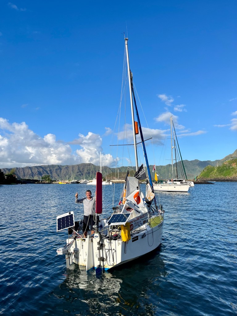 Even een zijstap, terug naar de eerste ochtend in Hiva Oa. Terwijl ik aan mijn ochtendkoffieritueel zit, komt daar een klein sportief zeilbootje binnenvaren. Stickers van sponsoren op de romp en verschillende vlaggen in het want. Zou het? Ja! Het is de eerste binnenkomer van de Mini Globe Race. Dit is een solo-zeilwedstrijd rond de wereld in boten van slechts 5,80 meter. Het blijkt Renaud Stitelmann te zijn, die er rechtstreeks vanaf Panama 34 dagen over gedaan heeft om hier te komen. Boten van twee keer zijn lengte hebben er langer over gedaan, wat een prestatie! 34 dagen alleen in een heftig bewegende boot met een binnenruimte zo groot als een kleine auto zonder stahoogte. Ik klap uitbundig en pak de camera om het moment vast te leggen als hij langsvaart. Hij is op zoek naar een ankerplek en vraagt of hij bij ons mag aanknopen om eerst even te rusten na 40 uur wakker te zijn geweest. Dat is een vanzelfsprekendheid en we knopen hem vast. Die avond zit Renaud met cruisers van verschillende boten aan tafel bij de Curious voor een potluck. Na al die weken solo zit hij wel verlegen om een praatje en hij deelt zijn stoere zeilverhalen. Ook toasten we met zijn speciale Antigua rum. De start van de race was afgelopen november in Antigua in de Caribbean. Daar kocht hij de fles. Als hij de fles daar over een jaar leeg over de finish brengt, krijgt hij van de uitbater van een lokale kroeg een nieuwe fles. We helpen hem graag te toasten op deze etappe.