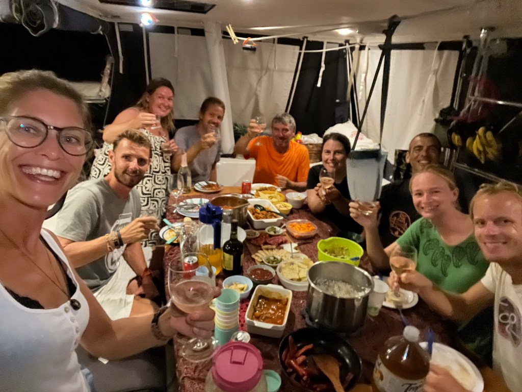 En zo kwam een eind aan het verblijf in Tahuata. We voeren het uurtje terug ‘de hoek om’ naar Hiva Oa om inkopen te doen en voor een kleine reünie alvorens we ons laatste eiland van de Markiezen, Nuku Hiva, zouden gaan ontdekken. De reünie was met niemand minder dan onze buddies van de Rollercoaster en vriendje Hugo!! Wat een gezellige avond, het smaakte naar meer. Maar eerst dus Nuku Hiva… wordt vervolgd.