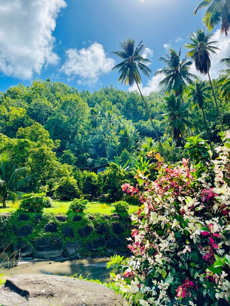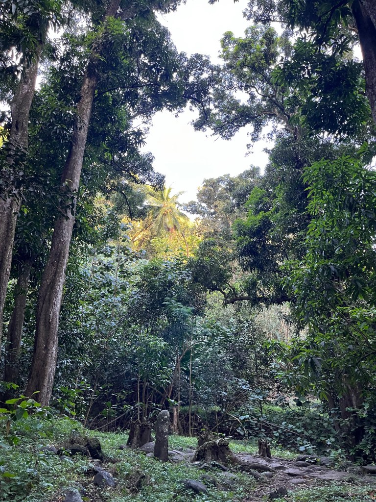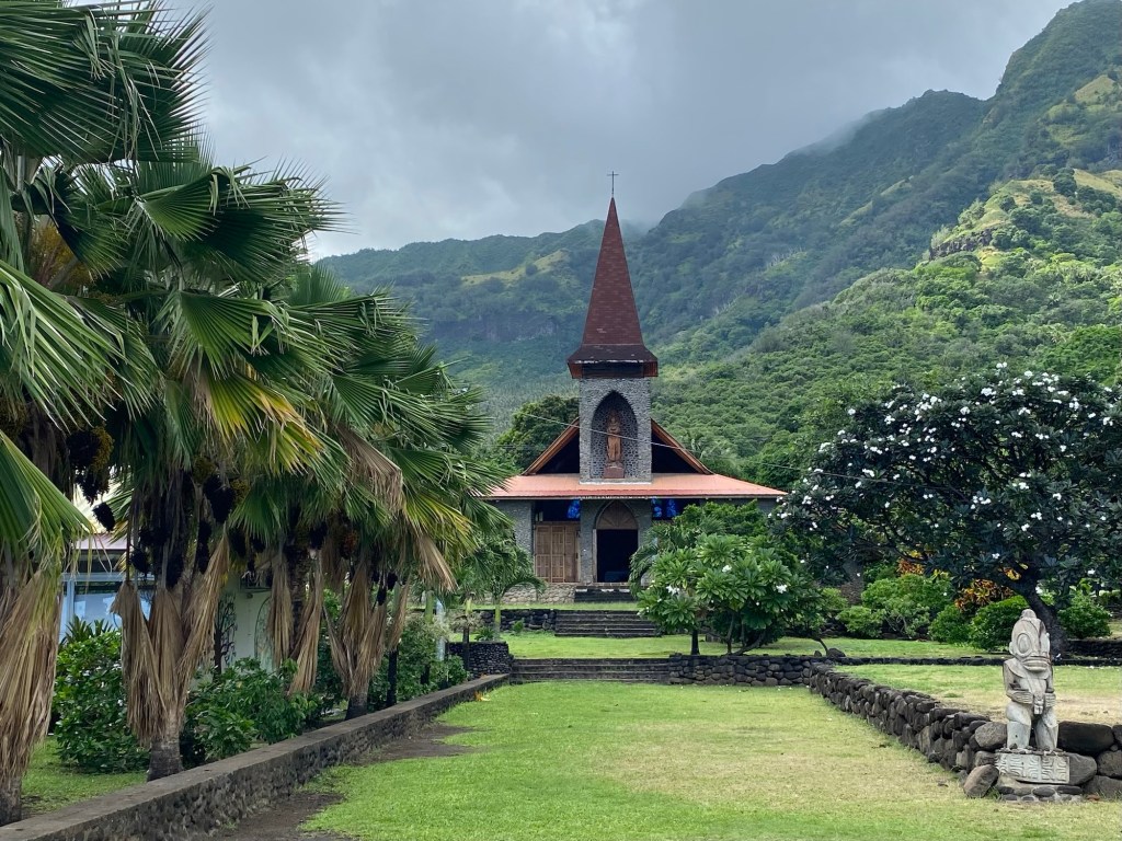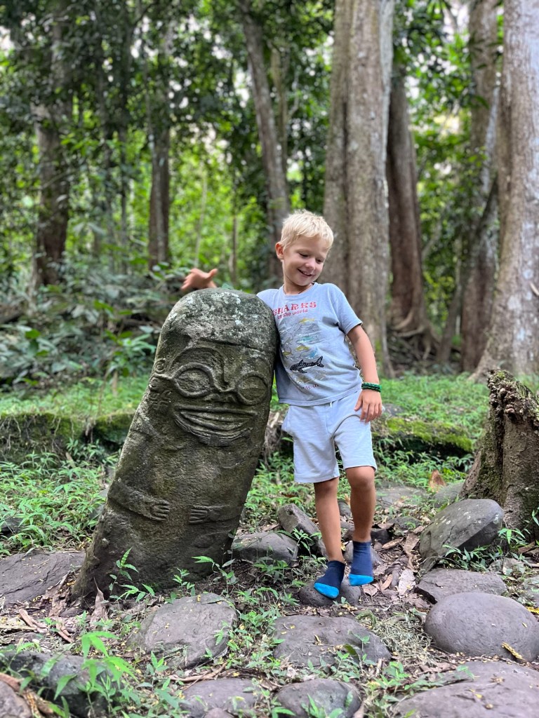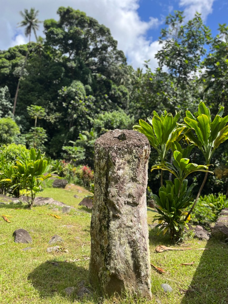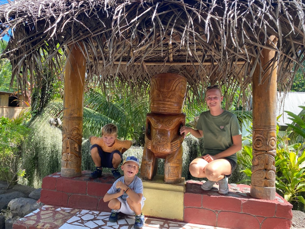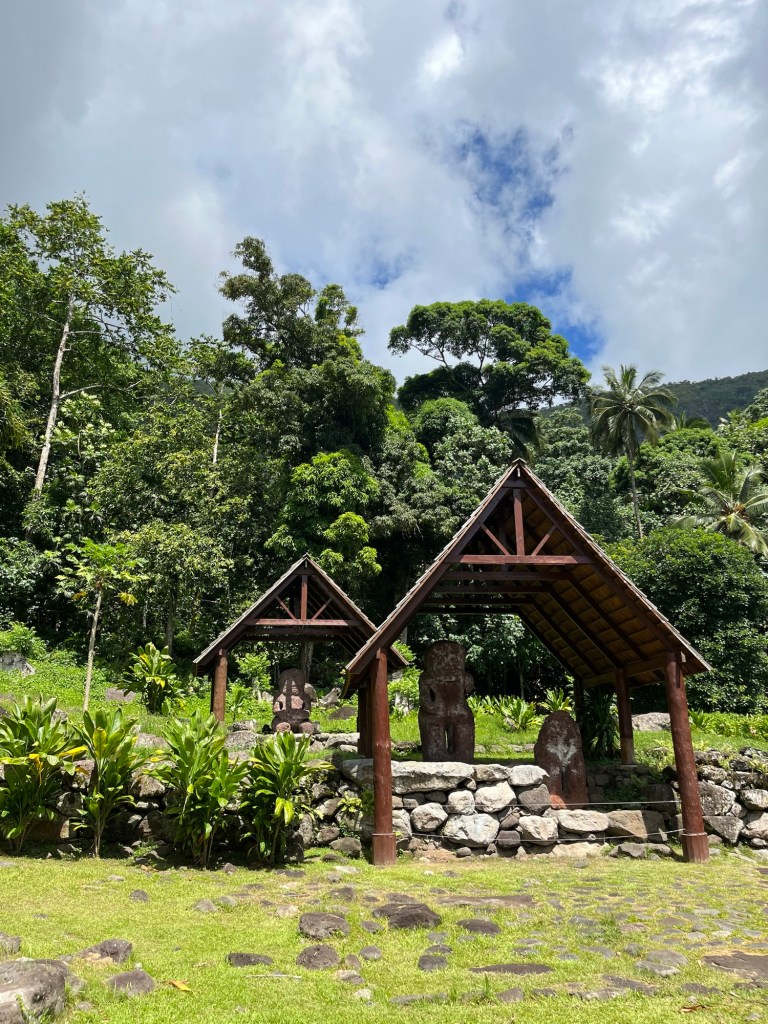 We bezochten tiki’s die diep verscholen lagen in de groene valleien, omringd door mango- en bananenbomen. Deze mysterieuze beelden van steen of hout zijn overblijfselen van de inheemse Marquesaanse cultuur. Sommige waren metershoog, begroeid met mos, en leken bijna op te gaan in het oerwoud. Ze straalden een stille kracht uit, alsof ze de eeuwenoude verhalen van voorouders bewaarden als beschermers van dorpen, wachters van heilige plekken. In het dorpje Puamau bezochten we Tiki Takaii, de grootste tiki van de Marquesas, met een kalme maar indringende blik richting de bergen.