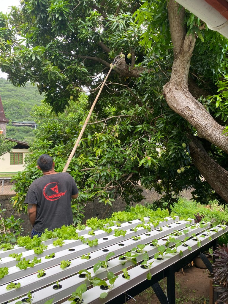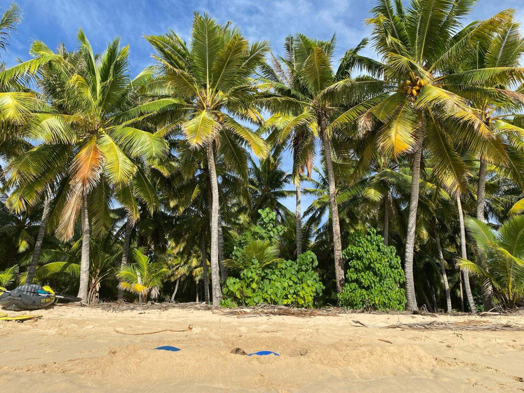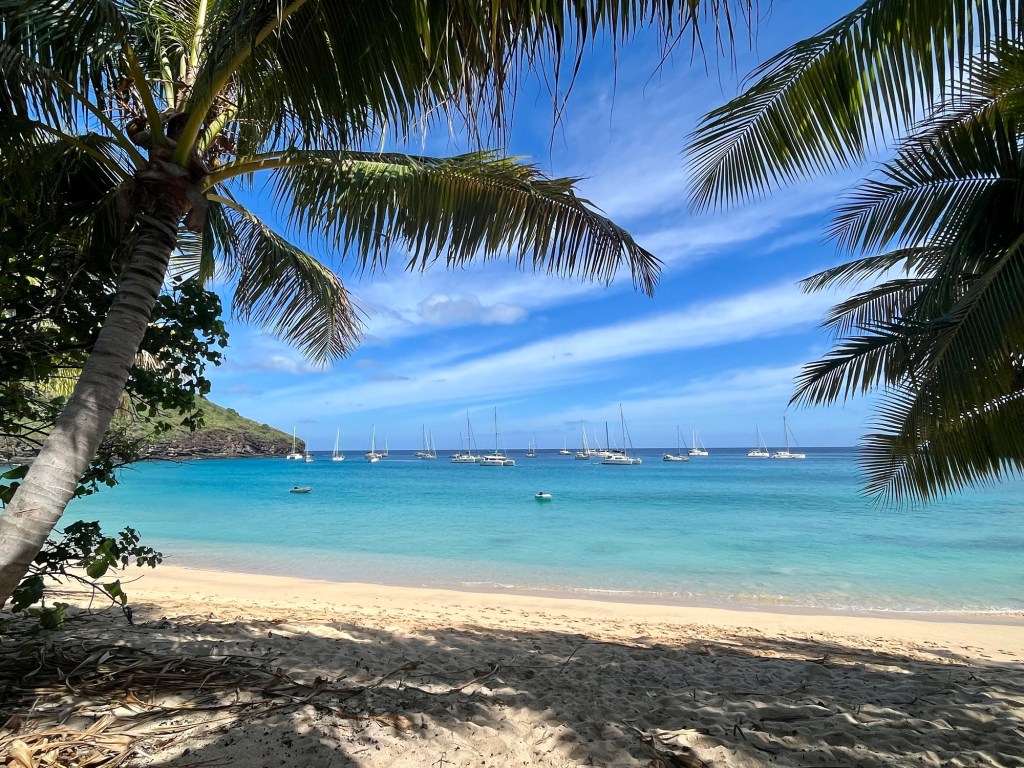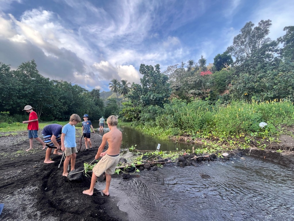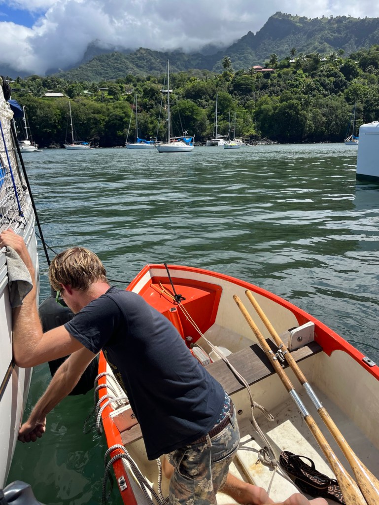 Wat ook een prestatie was, was het inparkeren op deze ankerplek in Hiva Oa. De Markiezen staan bekend om ankerplekken met veel deining, relatief onbeschut dus. Dat betekent dat je erg van gangboord naar gangboord schommelt terwijl je voor anker ligt. Zodanig dat je geen kopje veilig op het aanrecht kunt laten staan… Om de lekke doorvoer te repareren hadden we juist vlák water nodig. Daarom besloten we naast onze Pacific crossing buddies van Curious in te parkeren geheel ‘Mediterranean style’: aan de voorkant het anker uitgooien en met de achterkant met lange lijnen afmeren aan de wal. Met hulp van onze ‘canal line handlers’ Niels en Rosan om de lijnen naar de wal te roeien, was de manoeuvre gauw gepiept. Zo vlak langs de wal lagen we aardig stil en kon de klusweek beginnen.