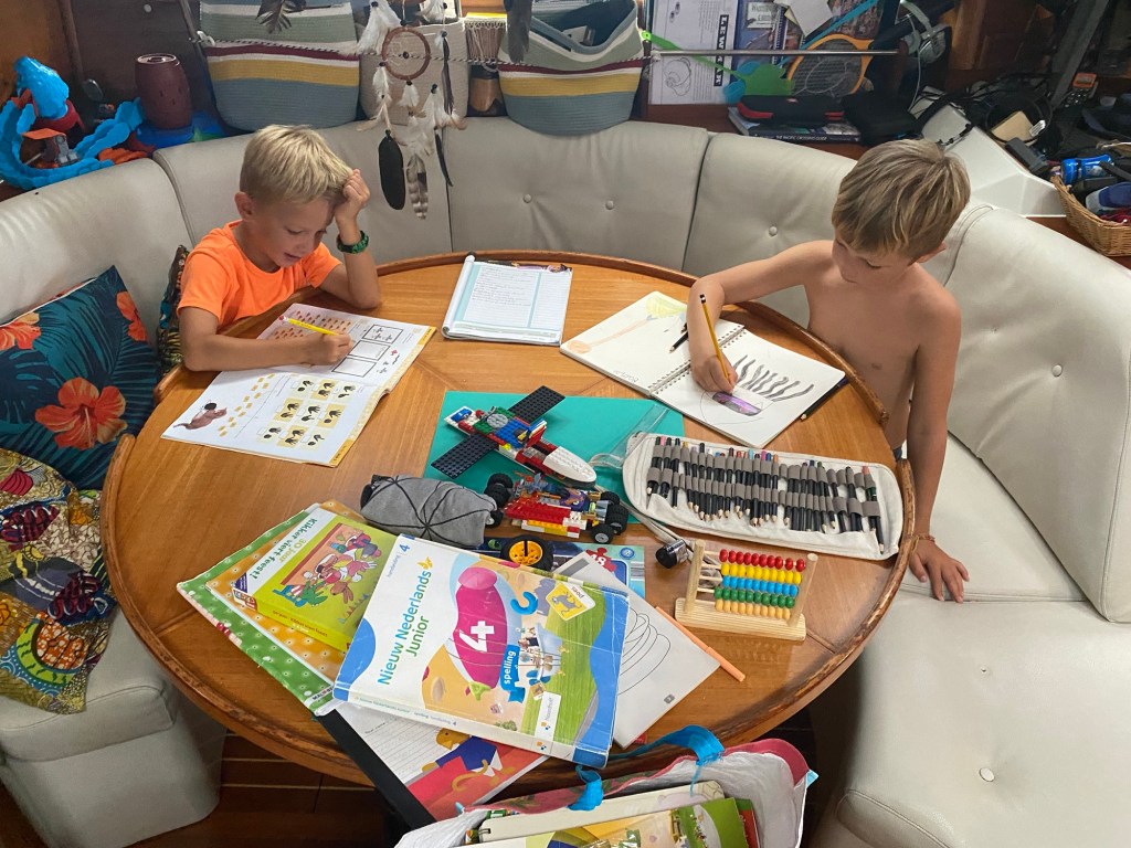 Terwijl ik school opstartte met de jongens na ruim drie weken ‘vakantie’, begonnen Leon en Niels aan de doorvoer. Als contragewicht om zeker te zijn dat de werkplek aan stuurboord boven water bleef, hing Leon de dinghy aan de giek over bakboord. Niels werkte aan de buitenkant, Leon aan de binnenkant. Ik fungeerde als boodschapper tussen de twee. Ze slaagden erin de doorvoer er in zijn geheel uit te halen en opnieuw erin te kitten. Check!