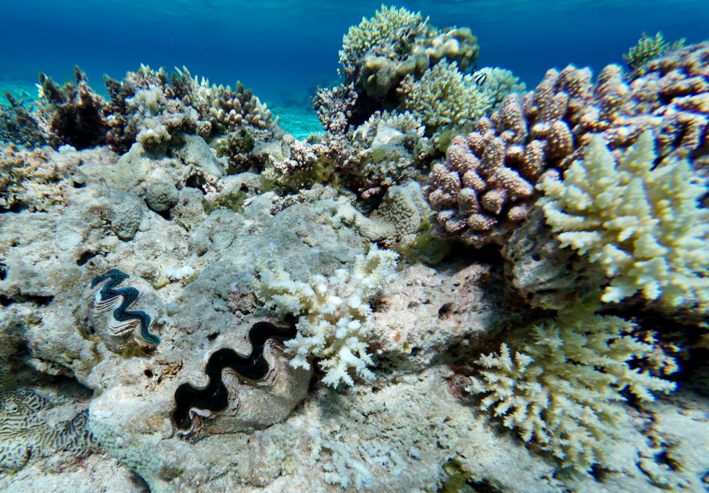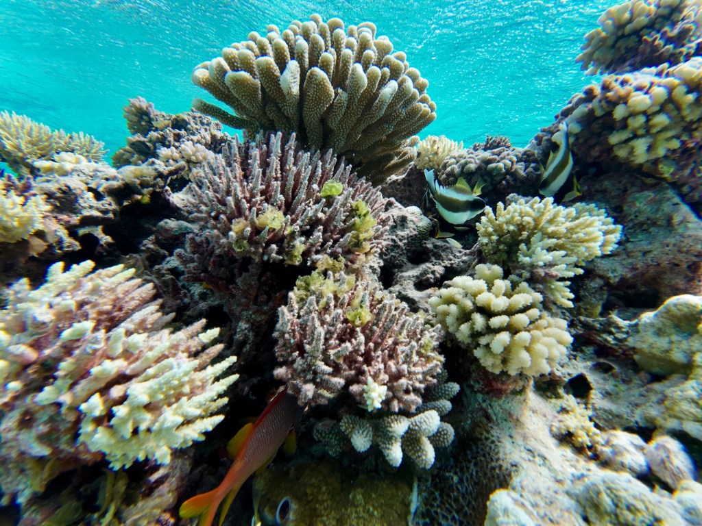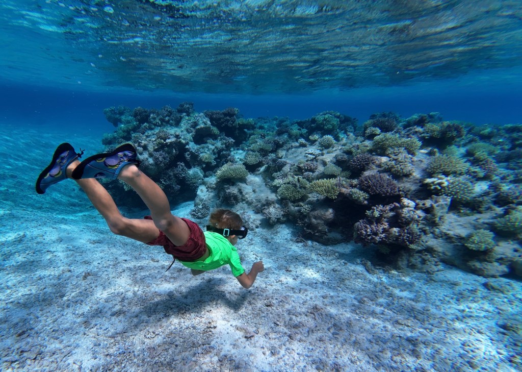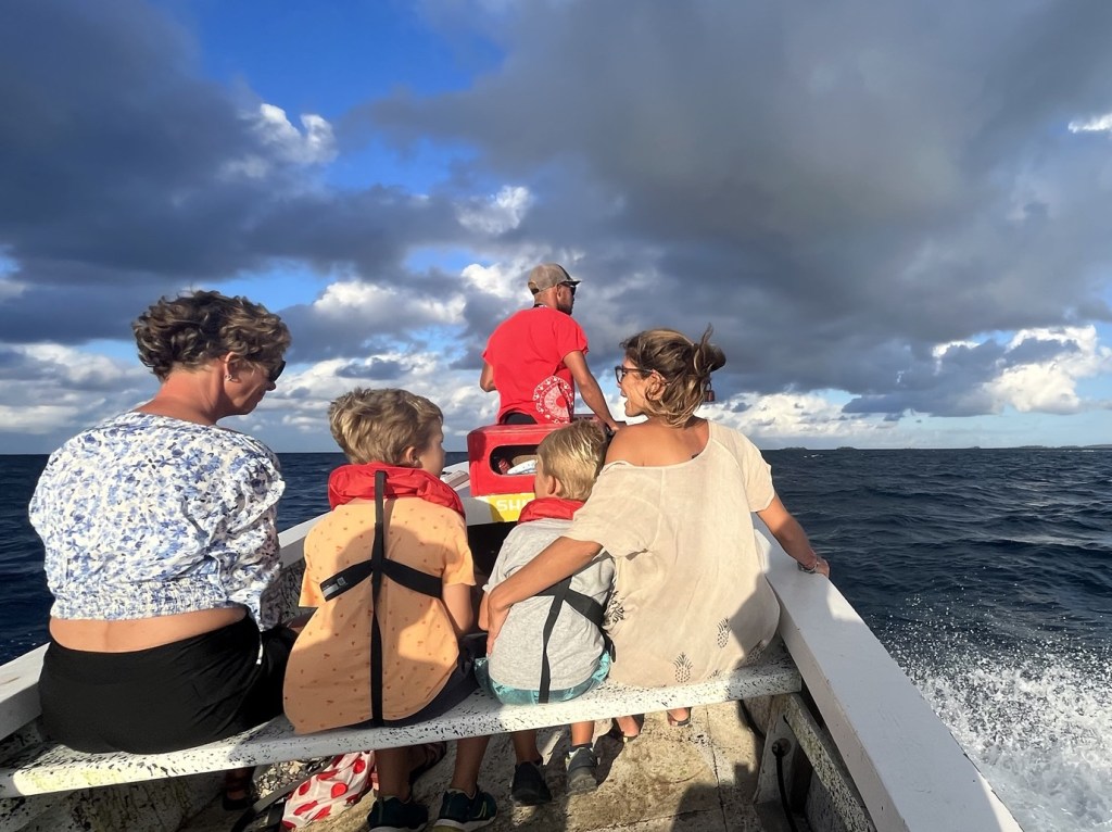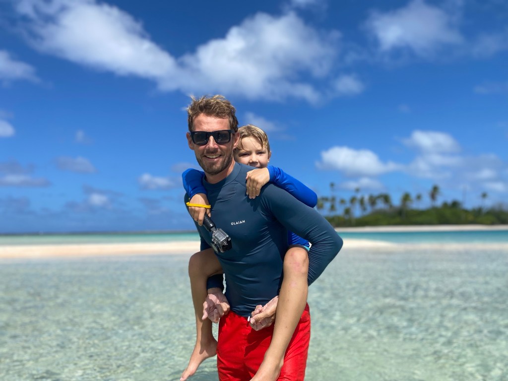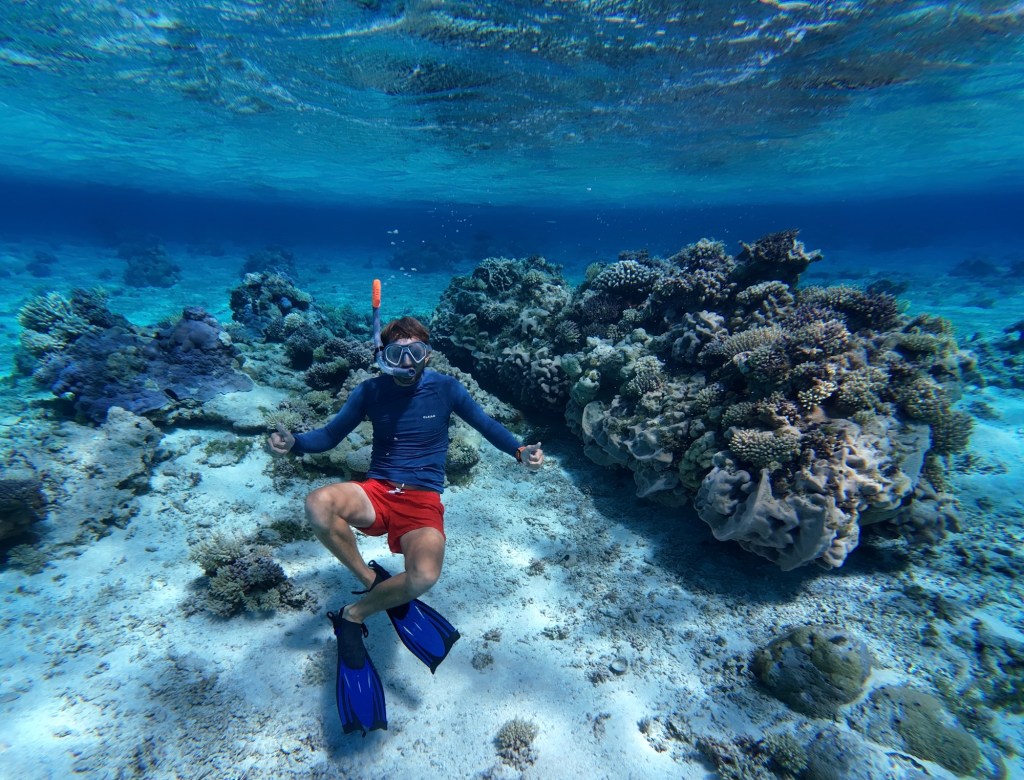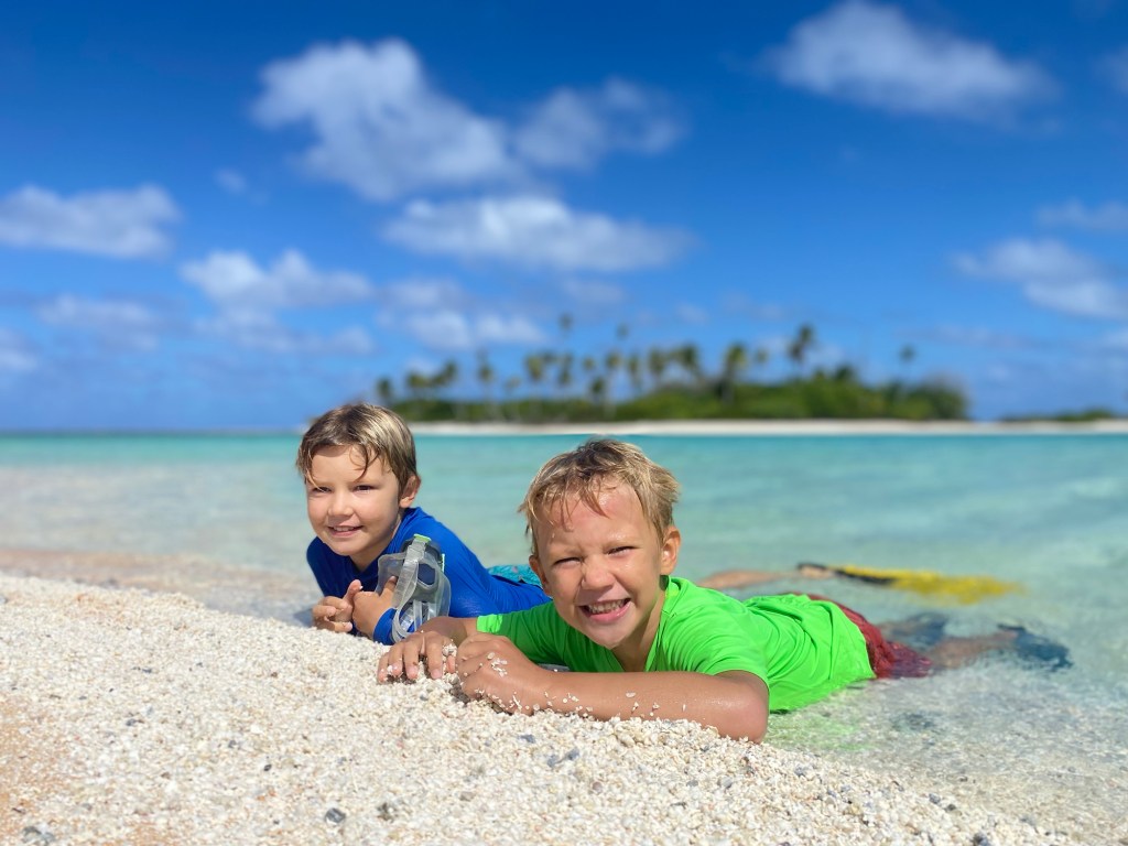 Het eerste wat we deden was het onderwaterleven ontdekken. Het duurde even voordat we alle vier onze wetsuits – het water is hier middenin de oceaan is een stuk kouder dan in de Carieb – en snorkelgear aan hadden, maar toen… alsof we een levend schilderij in dreven. Gezonde koraalpartijen in velerlei kleuren lagen verspreid in een glooiend bed wit zand. Het water was zo helder dat het voelde alsof we in een eindeloos zwembad zwommen, we konden tientallen meters ver kijken. Vissen hadden alle kleuren van de regenboog en we zagen soorten die we nog nooit eerder hadden ontmoet. Toen er plots een paar rifhaaien rustig onder ons voorbijgleden, hielden we uit verwondering even onze adem in.