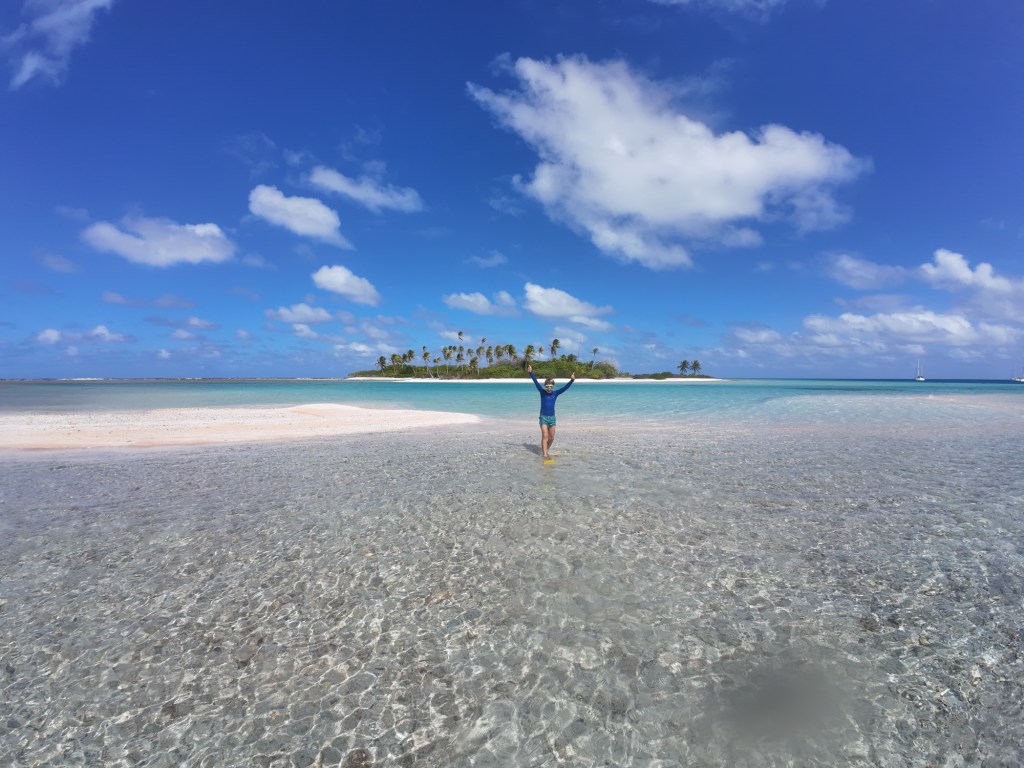 We arriveerden in de ochtend voor de pas van Raroia en wachtten buitengaats tot de condities kalm waren en voeren – met flinke tegenstroom weliswaar – over een vlakke doorgang naar binnen. Onze eerste atolpassage was een feit! Weer een stapje gezet buiten de comfortzone, weer een moment van het leven léven. Het contrast met de Markiezen met veel troebel water en onrustige ankerbaaien tegen een decor van hoge kliffen kon niet groter zijn. We ankerden achter een witte streep zand met palmbomen erop, op vlak water in een diepe blauwtint waarin we de schittering tot op de vijftien meter diepe bodem konden ontwaren.