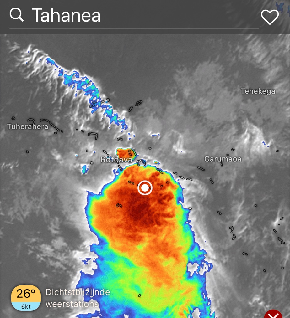 Twee dagen later. Tahanea brengt ons vooralsnog vooral grijze luchten en regen. Waren we in Raroia gebleven, dan was dat niet anders geweest. Het kan niet altijd feest zijn… Die avond lees ik een berichtje van de Pinnacle: of alles goed met ons is? Ik open de whatsapp-groep voor cruisers in Frans-Polynesië en lees over een storm cell die die middag over enkele atollen getrokken is. Meerdere boten zijn van het anker gegaan met schade tot gevolg. Wij hebben er in Tahanea niets van gemerkt. Tip is om vooral de satellietbeelden in de gaten te houden want deze lokale stormcellen worden niet voorspeld. Voor het naar bed gaan checken we satellietkaarten en zien hoe een tweede grotere cell vanuit Tahiti richting de Tuamotus trekt. De cell intensiveert nog steeds. We zetten de wekker om middernacht om dan nogmaals te checken.