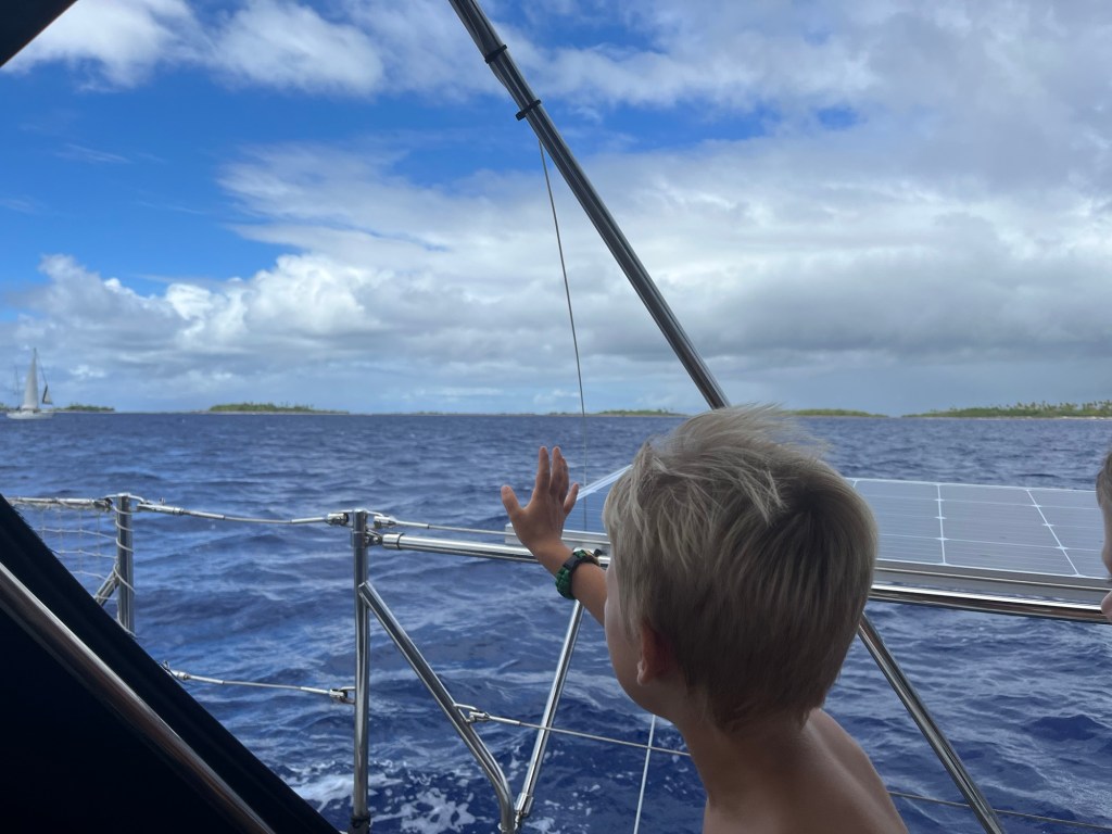 De adrenaline zakt langzaam; we zijn door de pas en draaien linksaf. We moeten nog 7 mijl dwars door het ‘binnenmeer’ varen naar de oost anchorage waar we beschut liggen achter de motu’s, de kleine eilandjes die samen met het rif de ring van het atol vormen. We varen op satellietkaarten waarop de zogenaamde ‘bommies’ – pilaren van koraal die van tientallen meters diepte naar de oppervlakte komen – duidelijk zichtbaar zijn. Eenvoudig varen we ertussendoor en ik maak lunch voor de jongens.