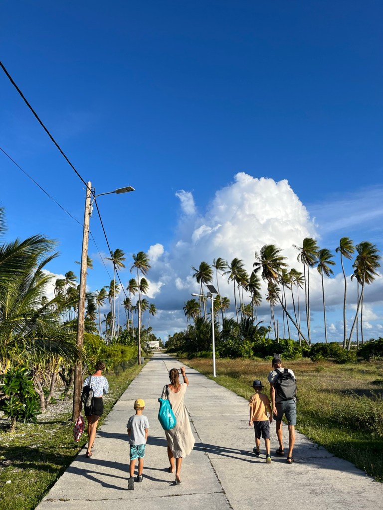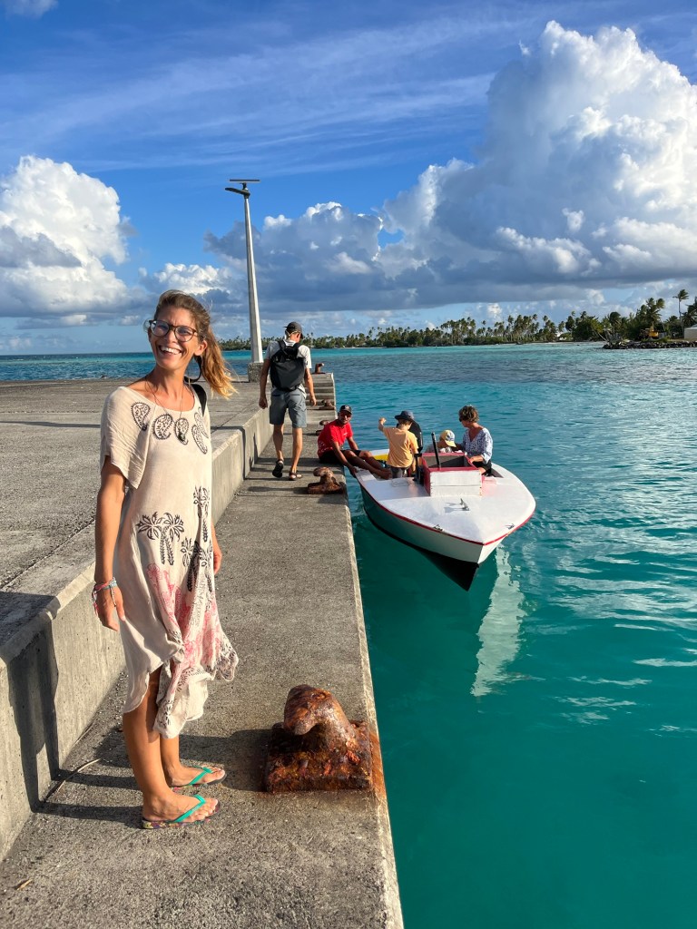 De kaarten lieten een aankomende weersomslag zien. We zouden óf nog een periode in Raroia ‘mogen’ liggen of we zouden al na enkele dagen verder moeten. We kozen voor het laatste. Op de laatste dag in Raroia bezochten we het dorp samen met Richard en Marianne. Eenvoudige huisjes met golfplaten daken stonden verspreid langs de enige weg vol schaduwrijke palmbomen. Het tempo lag laag, de mensen groetten vriendelijk, en de kleurrijke bloemen en turquoise lagune vormden een schilderachtig decor. We lunchten tonijn op drie verschillende wijzen bereid bij local Kali. Zittend aan een lange tafel in zijn achtertuin, uitkijkend over de blauwtinten van de lagune overviel me een gelukzalig gevoel: living the dream!