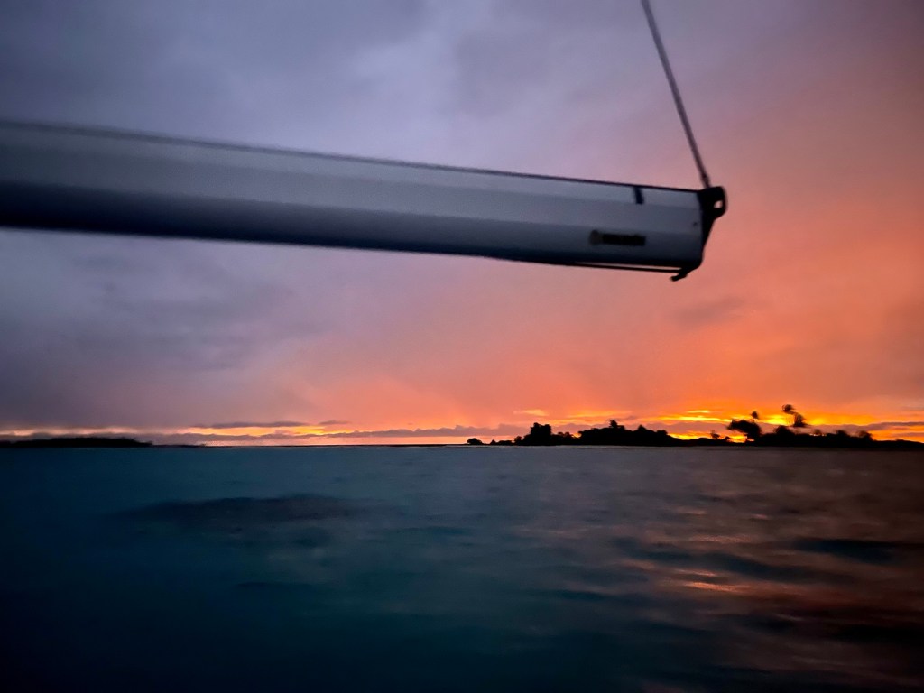 De zon komt eindelijk op. De donkere vlek linksonder in beeld is de ondiepe ‘bommie’. We liggen er een bootlengte vandaan.