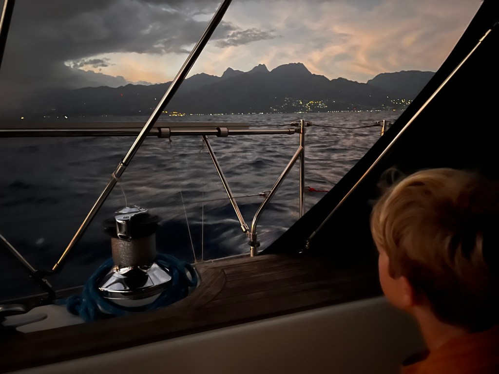 De tweede nacht zit mama gezellig bij me in de kuip tijdens de wacht. De volle maan verlicht de zee. Mama verbaast zich over hoeveel licht de maan geeft. Ze had een pikkedonkere hemel verwacht, maar niets is minder waar. Het is mooi om door mama’s ogen deze oversteek te ervaren. Zelf heb je vaak niet meer zo in de gaten hoe uitdagend en uniek een oversteek is. Al gaan de diepblauwe kleur van de diepzee, een volle maan of juist een donkere sterrenhemel nooit vervelen. Bij het krieken van de derde dag doemt het silhouet van Tahiti op aan de horizon.