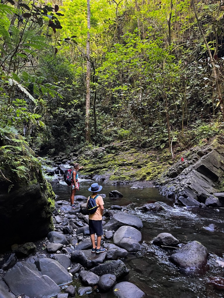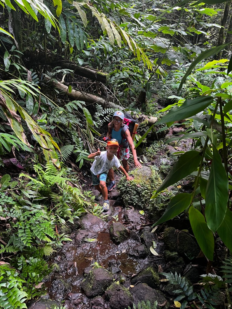 Tahiti is het episch centrum van Frans Polynesië. En dat merken we. Het doet minder gemoedelijk aan, is stadser en meer gericht op business. Maar het heeft nog steeds een overweldigende natuur. We zwemmen in een grot, hiken door naaldbossen met uitzicht op het rif, en vinken een denkbeeldige strippenkaart voor watervallen af: les Trois cascades, Jardin d’Eau de Vaipahi en de betoverende Fautaua falls. Voor die laatste hiken we vijf uur over rotsen en keien, over smalle paadjes langs steile wanden, waden meermaals door de rivier om vervolgens aan de voet te staan van deze waterval met een hoogte van 300 meter. De betovering kracht bijgezet door de uitdagende wandeling die we hebben ondergaan om hier te komen. De jongens moesten diep gaan, maar wat een helden zijn het!