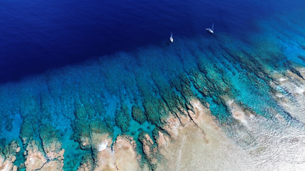 Niet veel later zien we hem verschijnen in een open bootje, dansend door de branding. Hij gebaart ons dichterbij. De zee beukt op het rif, roffelt als een diepe trom. Dan volgt een ondiepe koraalbank, acht tot tien meter diep, en daarna de afgrond: het atol dat kilometers de diepte in stort. Op zijn aanwijzing laten we het anker in het koraal zakken. De ketting schraapt over het rif, een geluid dat door merg en been gaat. Le Tournesol hangt boven de afgrond.