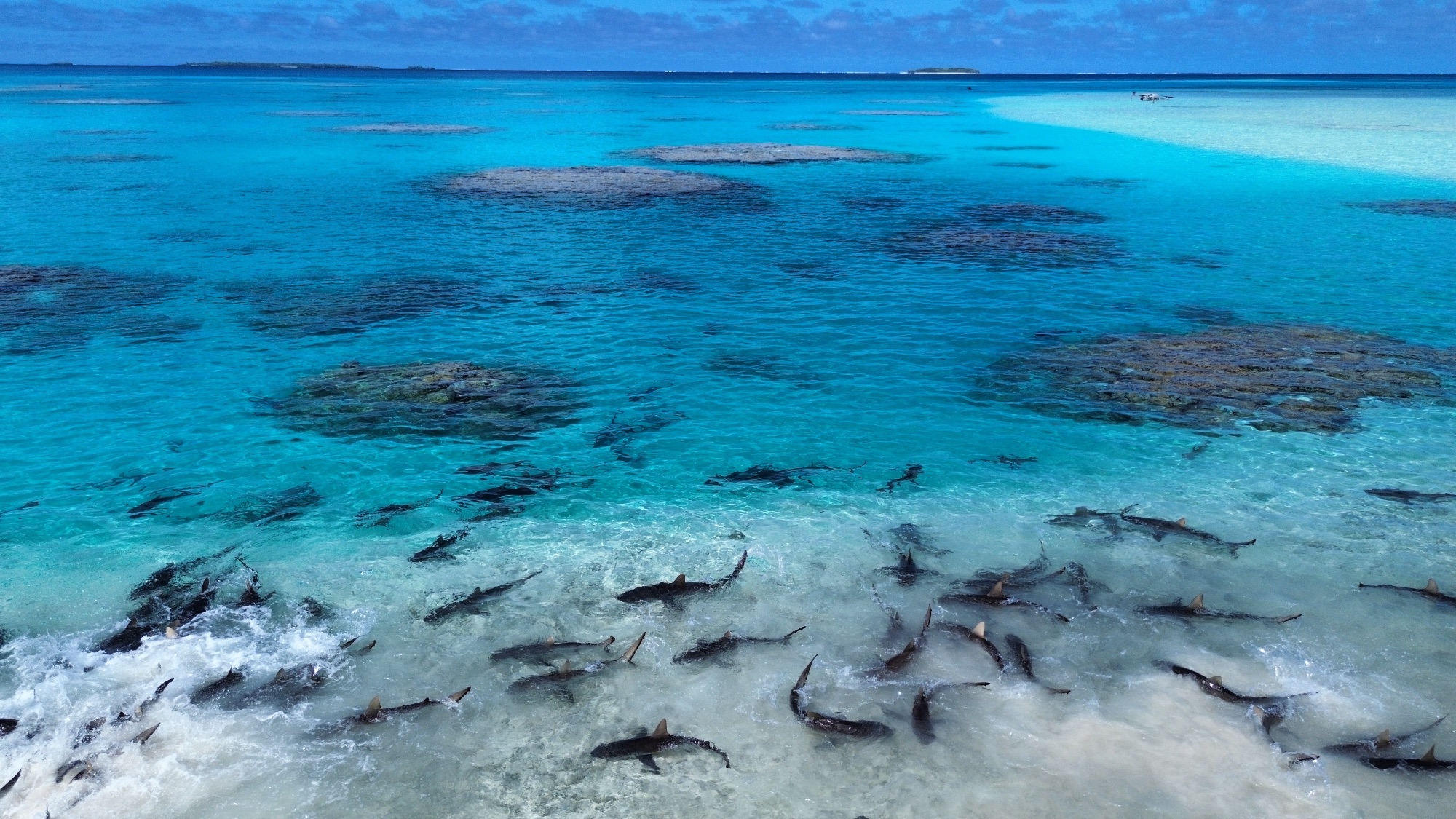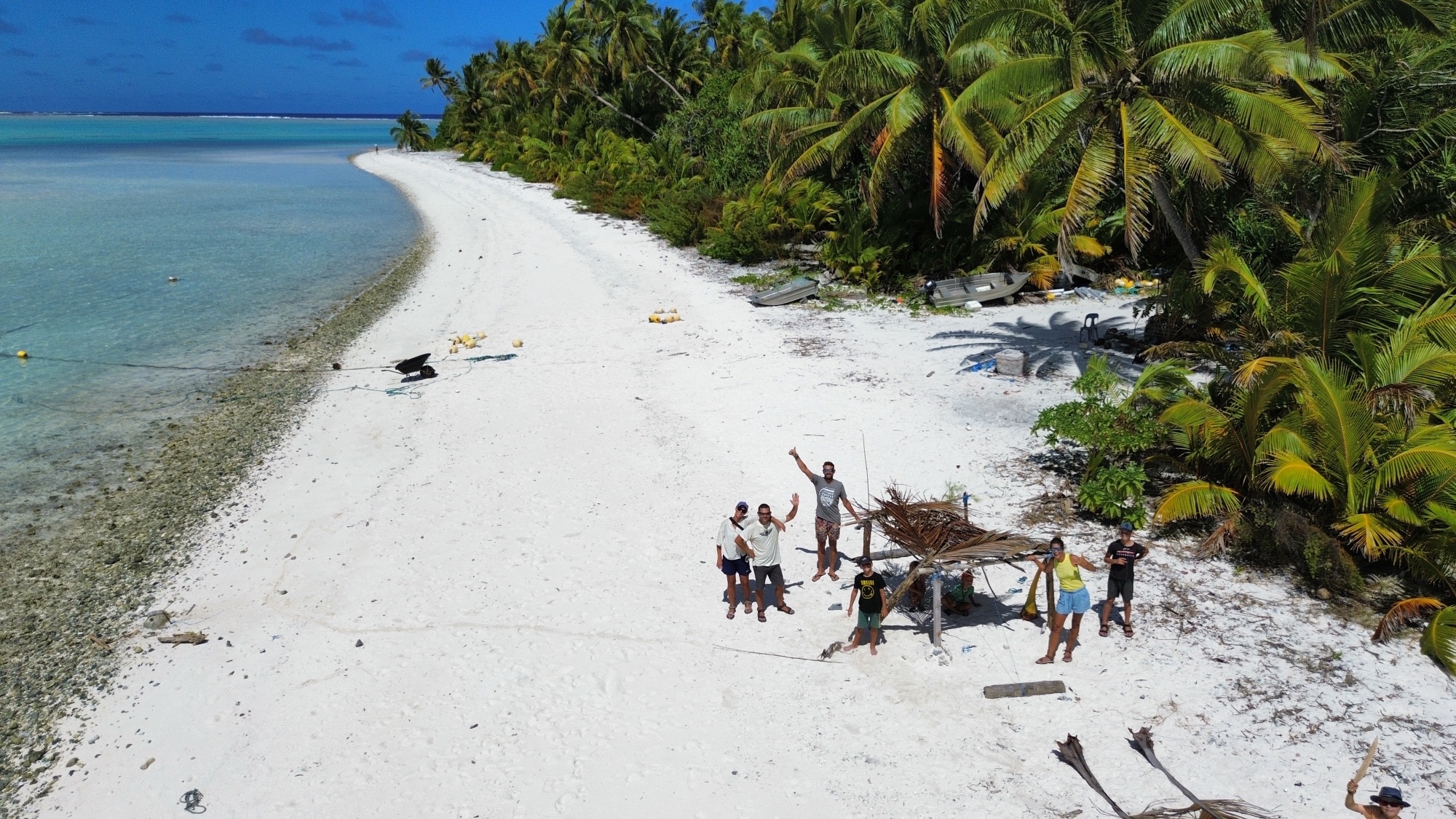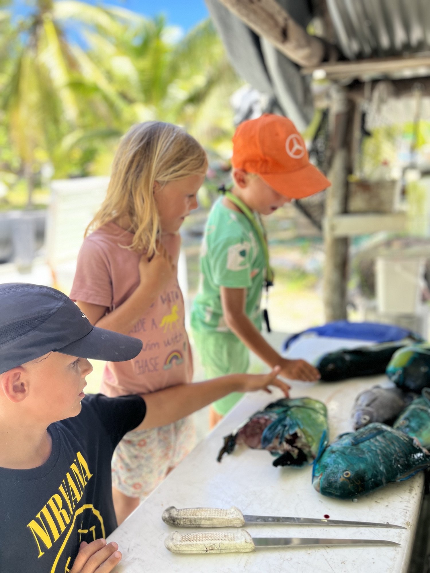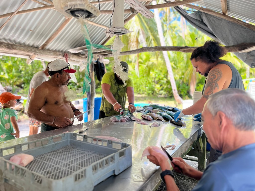 De eerste vissers komen terug met de vangst van de dag. We worden uitgenodigd mee te kijken hoe de vis wordt schoongemaakt. Ondanks de vrij primitieve manier van leven, is er een goed systeem en apparatuur om de vis te bewerken en in te vriezen. De karkassen van de papegaaivissen worden gevoerd aan de haaien in de lagune. Binnen seconden ontstaat een kolkende massa: vinnen flitsen door het water, golven spatten uiteen. Een angstaanjagend, adembenemend schouwspel. Zwemmen is hier uitgesloten,  terwijl het koraal tot aan de horizon schittert.