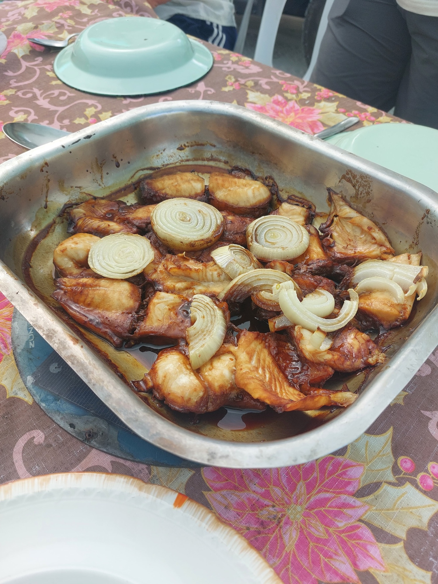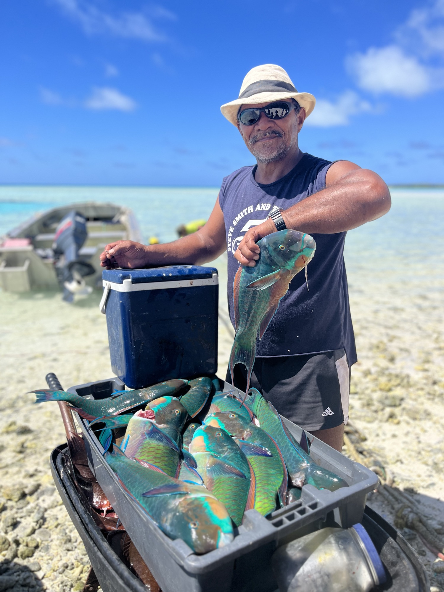 Dan mogen we aanschuiven bij Edward. Samen met zijn broer heeft hij voor ons een lunch met papegaaivis en rijst voorbereid. Alhoewel wij de felgekleurde vissen in de tinten groen, blauw en paars liever onder water bekijken, begrijpen we dat papegaaivisfilet dé inkomstenbron is het van eiland. Filets worden ingevroren en eens per kwartaal door het bevoorradingsschip afgeleverd in Rarotonga.