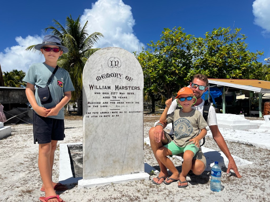 Tijdens de rondleiding leren we meer over de familiegeschiedenis. Palmerston’s vlag heeft vijf sterren, legt Julianna uit, omdat William Marsters niet drie maar vijf families stichtte, twee ook in Tahiti. We bezoeken het originele huis van William Marsters en zijn graf.