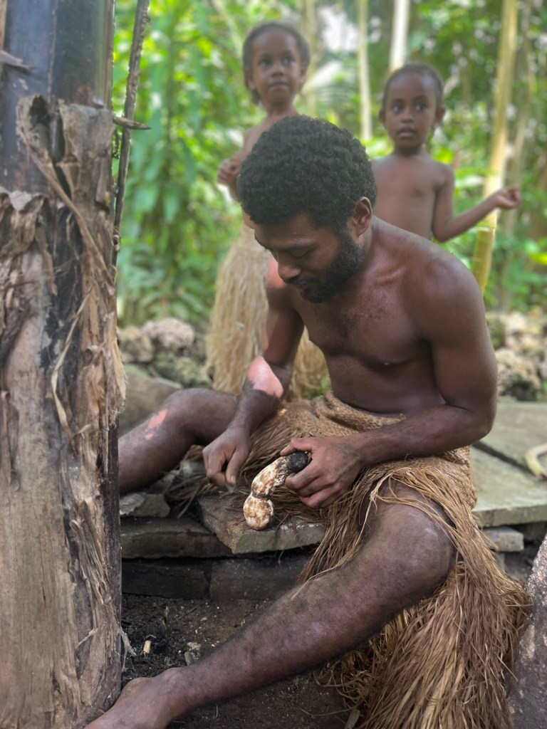 Onze eerste stop: Pepeyo Cultural Village, het Vanuatu-equivalent van een openluchtmuseum. Schrille kreten, krijgers die uit de bosjes sprongen, speren in ons gezicht. Snel fluister ik in Bruis’ oor: “Het is nep.” Toch stokte zijn adem even. Zo werden we verwelkomd in het dorp dat de traditionele levenswijzen van Vanuatu uitdraagt. De ‘dorps-chief’ vertelde ons over medicinale planten en het leven in de jungle: “Never disrespect your parents, because then they won’t teach you how to survive in the jungle.” Het was dé les van de dag, die Bent later in de auto herhaalde: “Dus als je geen respect hebt voor je ouders, kun je hier niet overleven.” Een mooie levensles.