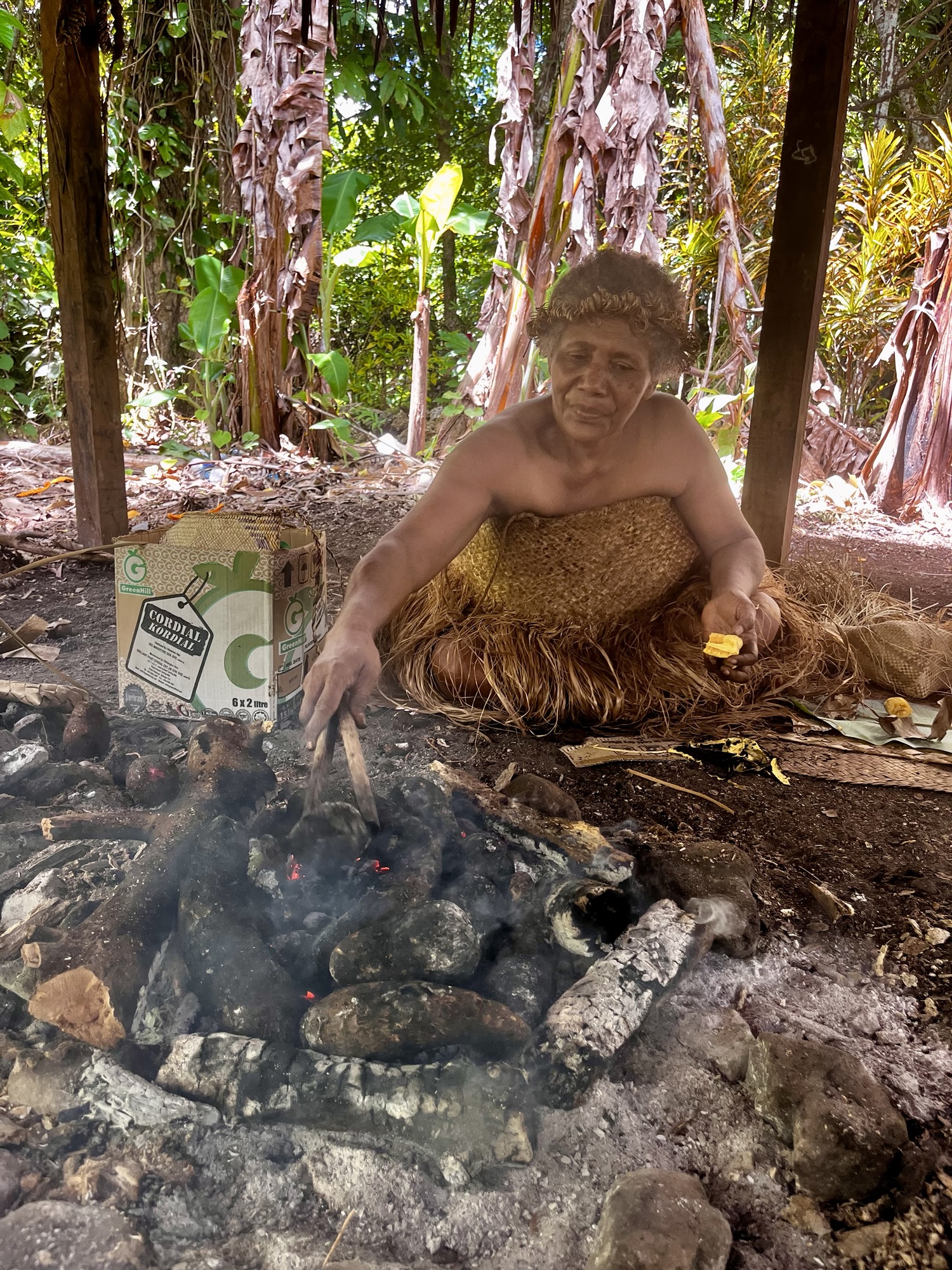 Er werd gezongen en de dorpelingen lieten een traditionele krijgersdans zien, maar het hoogtepunt was het lopen over hete keien. Een krijger kauwde bladeren, maalde ze fijn en spuwde het mengsel op de voetzolen van de chief. Terwijl de dorpelingen een ritmische hymne zongen, stapte de chief op de gloeiende stenen. In trance zette hij de ene voor de andere voet terwijl de stenen onder hem siste en er damp opsteeg: indrukwekkend! Dit ritueel komt voort uit de grondovens waarin de stammen vroeger kookten en waarbij men over de hete stenen moest lopen om het voedsel in de oven te leggen. Het bladerenmengsel had de voeten van de chief beschermd.