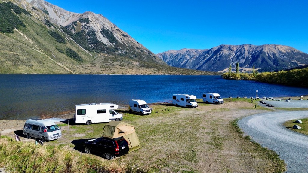De eerste avond zetten we kamp op bij Lake Pearson. Dit diepblauwe meer ligt onaangetast in het dal met de bergen als stille wachters eromheen. De avond is koel en donker. Zodra de zon achter de bergtoppen verdwijnt, daalt de temperatuur snel. Het eenvoudige leven krijgt hier iets bijzonders: afwassen in het ijskoude meer, handen tintelend van het water, terwijl je uitkijkt over datzelfde landschap waar je net nog doorheen reed.