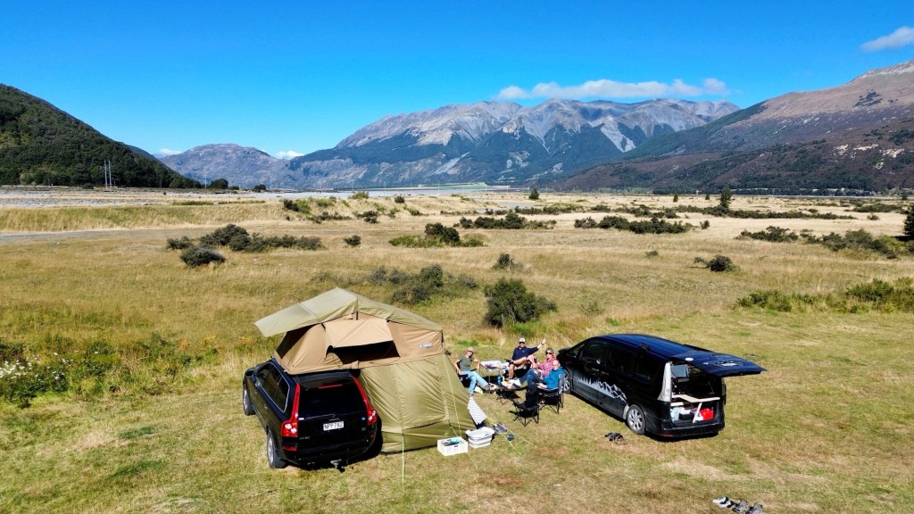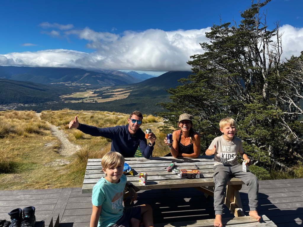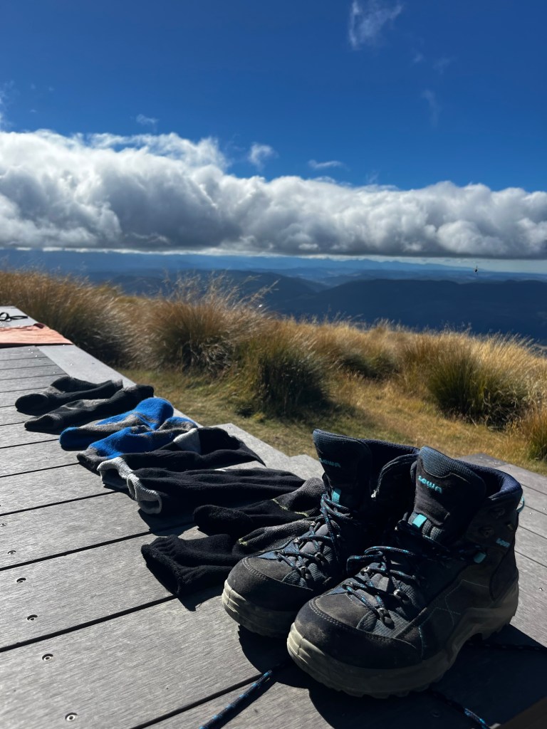Na een korte afdaling ligt daar in de bomenlijn onze slaapplaats voor vannacht. De middagzon straalt over de bergkammen en de wolken maken plaats voor uitzicht op de Saint Arnaud Range. We trekken onze schoenen uit en laten bezwete sokken en shirts drogen in de zon. De lekkernijen die we de berg op sleepten, stallen we uit op de picknicktafel. Het lauwe biertje smaakt verrassend goed. Dat extra gewicht was het meer dan waard.