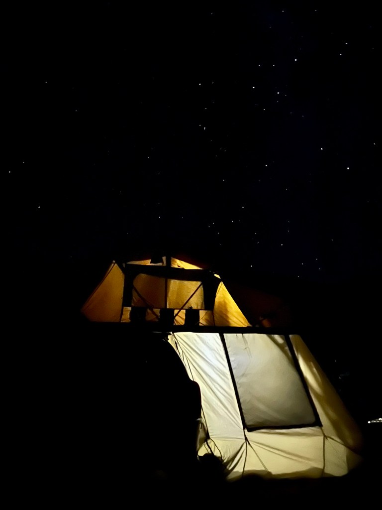 Als de jongens slapen, spelen we in de campervan bij Richard en Marianne een spelletje, lekker knus en warm. Als we teruglopen naar de tent, ontvouwt de hemel zich: eindeloos helder zo zonder luchtvervuiling. Even wanen we ons op zee.