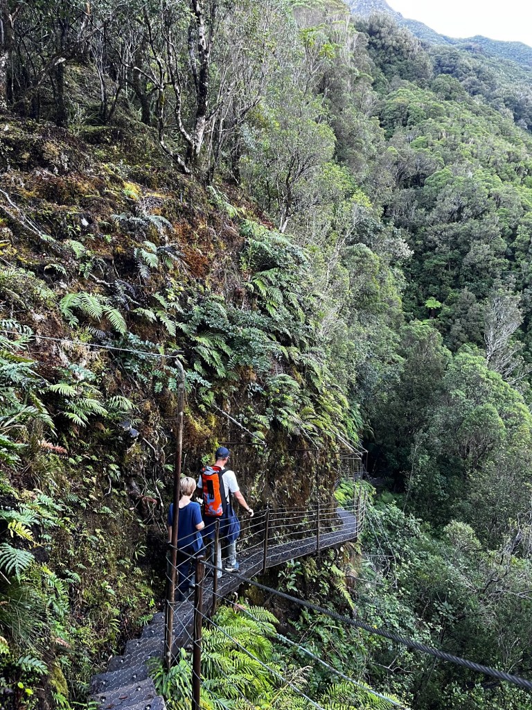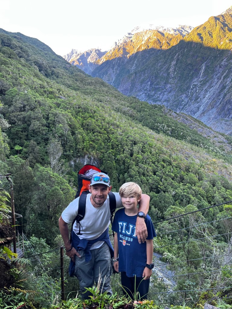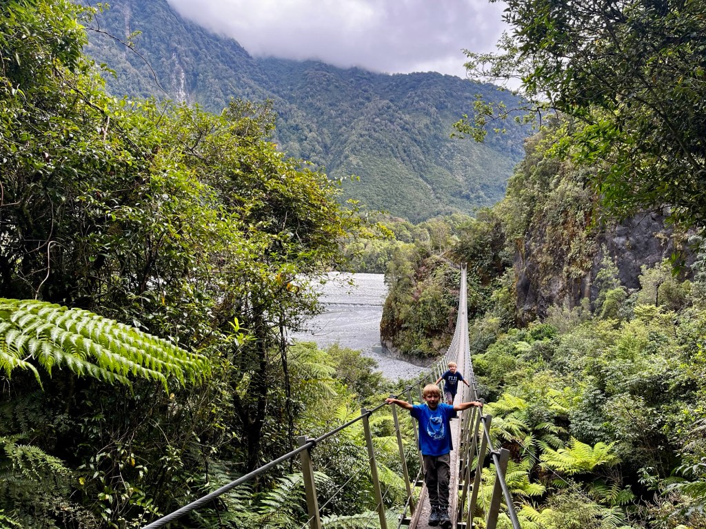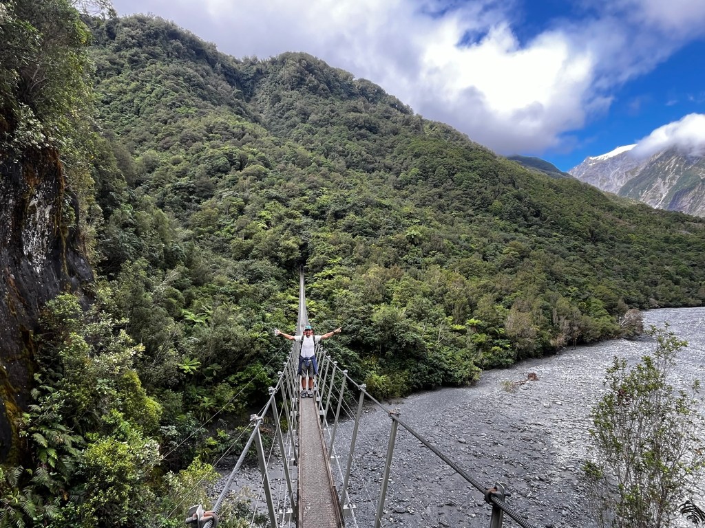 Skiën kunnen we nu nog niet, maar we willen de gletsjer wel van dichtbij bekijken, al blijkt ‘dichtbij’ relatief. We trekken onze wandelschoenen aan voor een tramping hike: een uitdagende hike van een uur of zes over rotsen, modder en wortels, met flinke hoogteverschillen. De Robert Point Track leidt naar een uitzichtpunt op de Franz Josef gletsjer. Maar wat deze tocht echt bijzonder maakt, zijn de hangbruggen: smalle, wiebelende overgangen hoog boven kolkende rivieren. En dan is er die ene brug van meer dan honderd jaar oud die tegen een steile rotswand is gebouwd, hij is er als het ware aangehangen. Je loopt langs de klif terwijl de afgrond naast je gaapt en het water ver onder je raast. Het voelt rauw en puur, alsof je even teruggaat naar de eerste avonturiers die hier hun weg vonden.